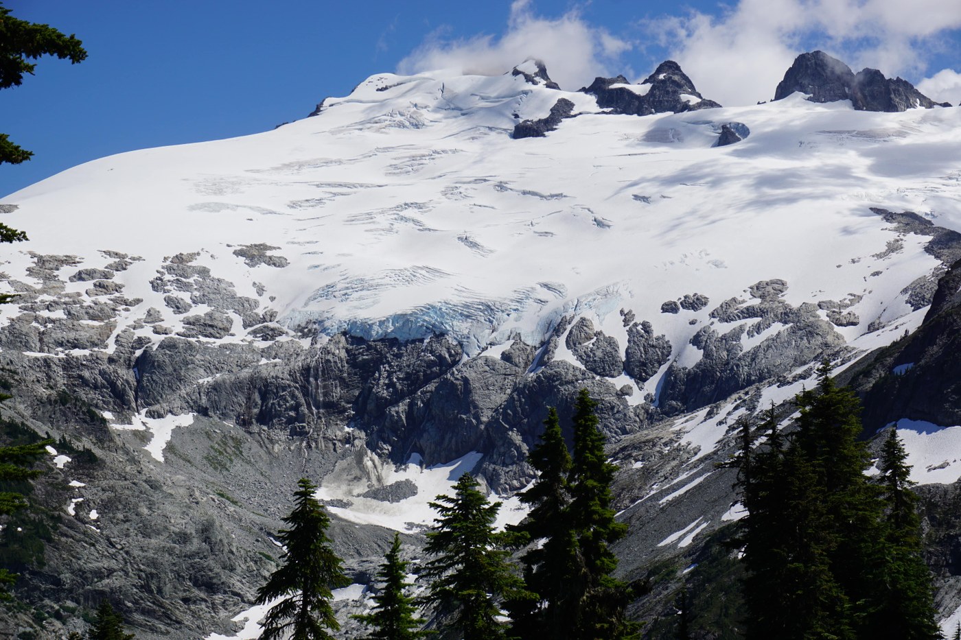 On day 2 we continued the loop to Indian Creek Camp. Our map showed Copper Lake as the last water source until the switchbacks down to the Chilliwack, but there were actually several streams right on the trail just north of Copper Lake, so you don’t have to go down to the lake for water (but it’s pretty). We talked with two different groups who had camped at Copper Lake and said they saw a black bear. Be prepared for some light route-finding over and around blowdown, especially on the switchbacks down to the Chilliwack. Others have complained about the brush on the trail, but we didn’t find it to be that extensive or bothersome; the majority of the valley part of the loop is pleasant forest-walking with lots of impressive cedar and fir trees to admire. Just wear long pants, and you’ll be fine on the brushy parts. Plus we saw tons of thimbleberry just days away from being ripe for some hungry hikers or bears to enjoy! The Chilliwack River ford is very manageable right now. There are two braids of the river to cross. One is only about ankle-deep; the water on the other section is up to about mid-thigh and feels great on tired muscles. Follow the pink tape on trees to find the route.