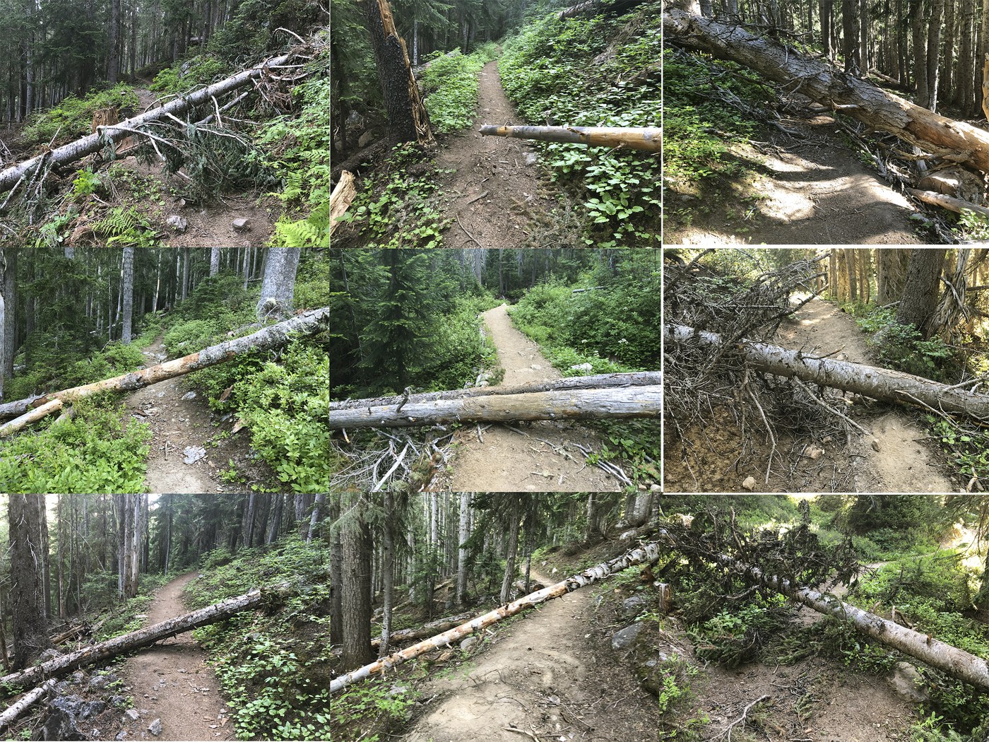 Trail: 9 trees across trail spread throughout first 4 miles(see photo collage). All were 6-12in diameter except the upper right in photo which was almost 24in in diameter. They all had dangerous sharp stobs protruding so I hope no one gets hurt before the PCT Team has time to remove them.