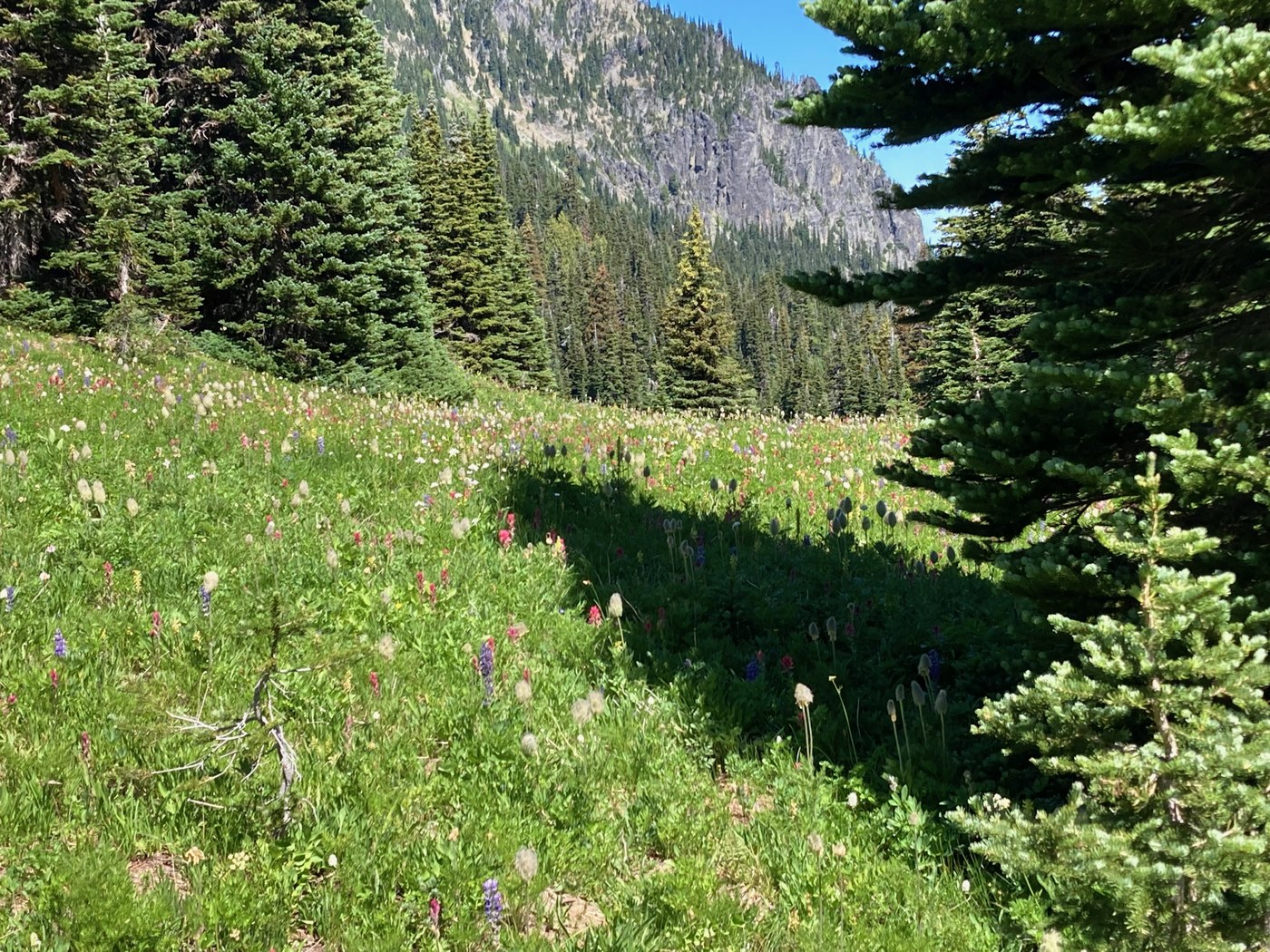 Wildflowers are full on beautiful, getting more and more colorful and lush the lower you go into the well-watered meadows of Berkeley Park. The meadows have the full array of alpine wildflowers blooming. My turnaround point was the BP campsites, where a field of avalanche lilies was blooming in the shade of trees.