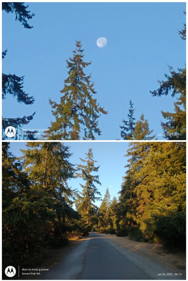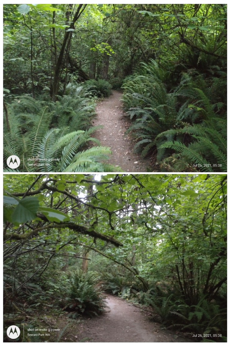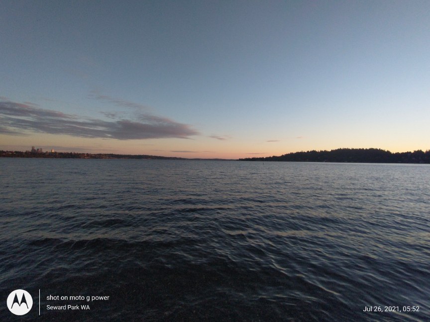 ~05:30 cool low 60s_F, i arrived at Seward Park. i did the ~2 mile ramble (CW) on the paved Shoreline and a little of the woods - it was quiet, and blissful … lovely trees and "understory". It was on the Shoreliine where i would encounter people - solo, pair, or small groups - cycling, jogging, strolling, or walking their dogs. By ~07:00 when i was leaving the Park, my guess is that i had encountered a total of ~30 people and 3 dogs. Everyone's cheerful, friendly and courteous.