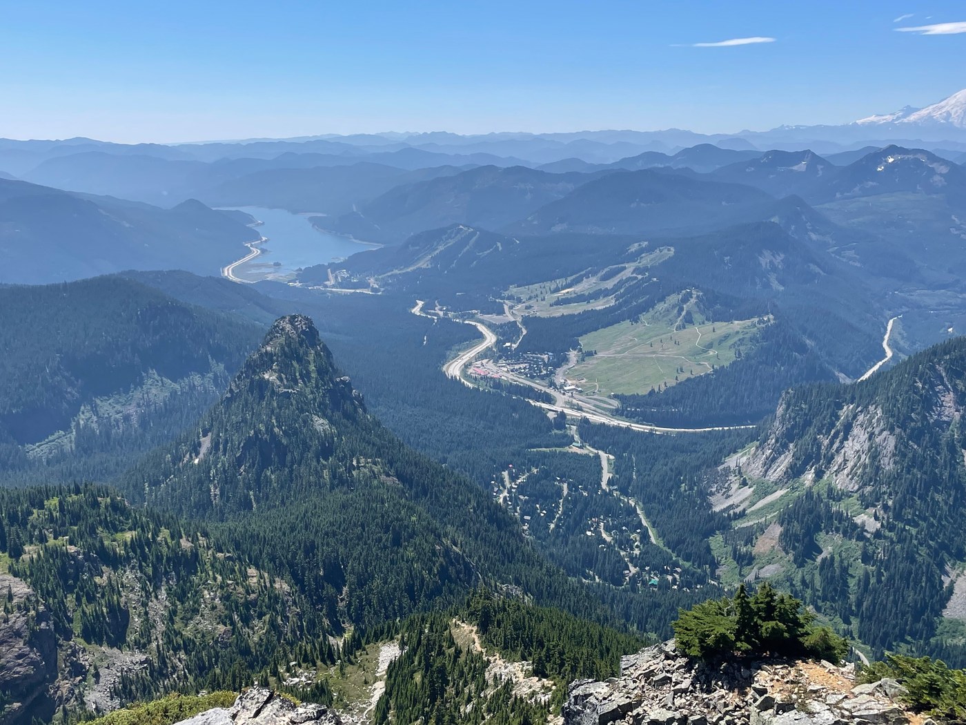 Started at 9AM on a warm day, and luckily the first half of the climb is in the shade and was cool. The first part of the trail is very rocky. Afterwards, the trail is steep dirt, and fully exposed to the sun (so start early on a warm day). Made many short rests and got to the peak just before 1130AM. The peak had many flying ants (little annoying but harmless) and also some mosquitos. Otherwise, the rest of the trail had only few bugs. Went till the NW end of the ridge for great views of snow lake. So many mountains are visible from the peak - to name just few, Rainier, Guye peak, Kendall peak, Glacier peak.