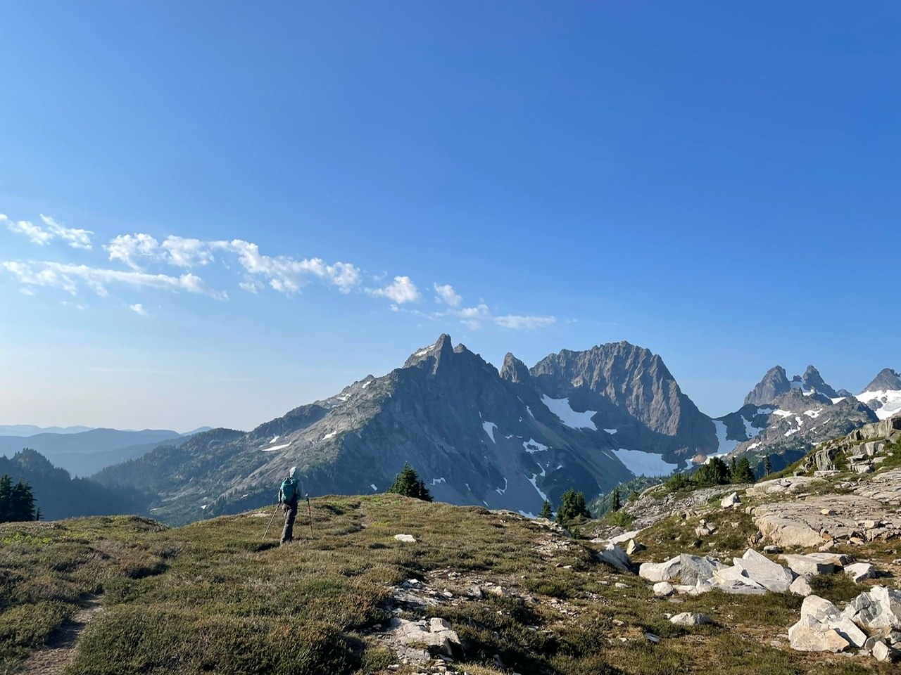 We continued past Jade lake, hoping to get away from bugs. We passed Opal and decided to keep going higher before setting up camp. The trail up towards Iron Cap is not clearly defined and requires route finding as there are many ways to get there through boulders and faint bootpacks. After 10.5 miles and 4200 feet on gain, we made it into the glacier moraine, found a flat rock and bivy’d there.