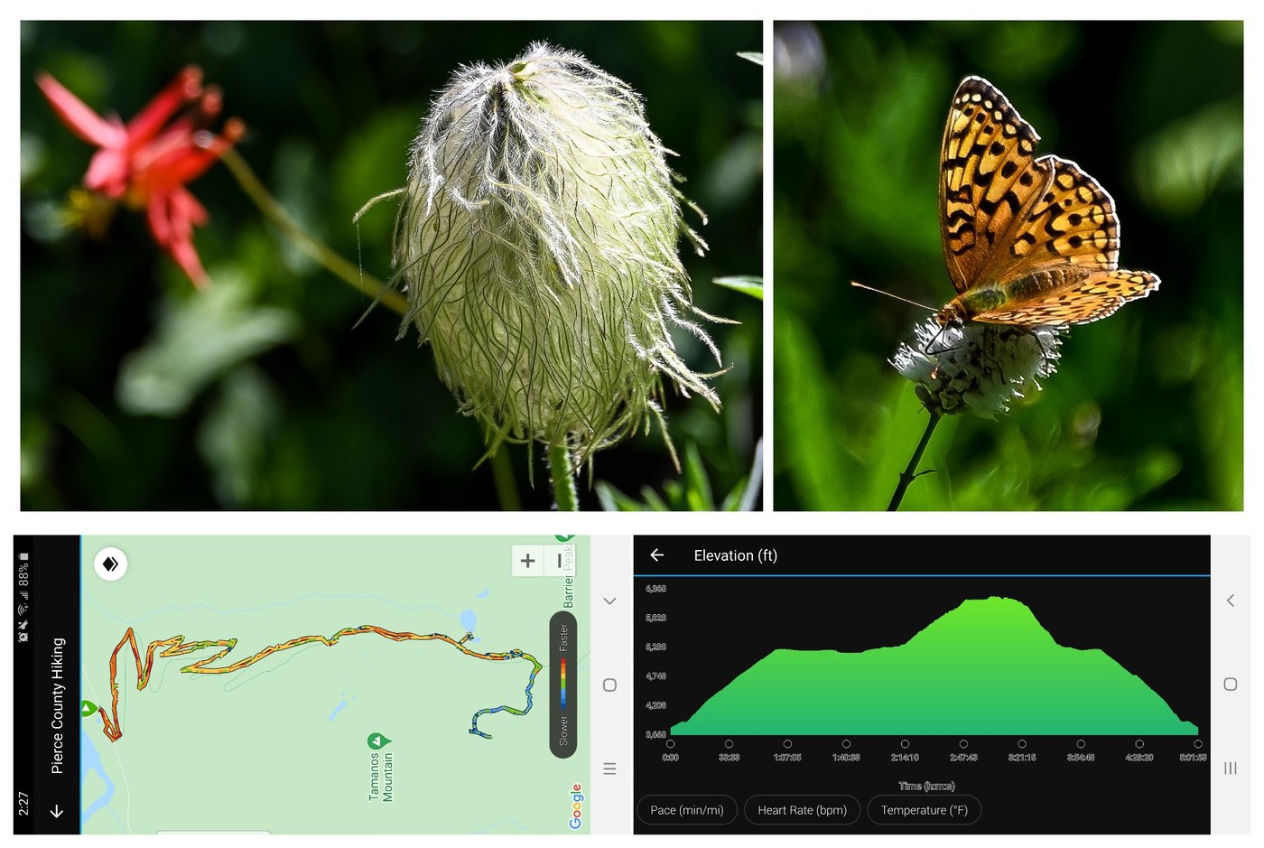 You can see in my Garmin screenshot below that I Immediately slowed down in the meadows. I wandered slowly thru flowers, butterflies and humming birds. The flowers vary a lot on this route. They are definitely past in the early meadows, peak in the more shaded areas between the Lakes and the turnoff to Tamanos, and are somewhat otherworldly on the open slopes up to the Tamanos saddle. Here you can see orange colored slopes from a distance given the explosion of paintbrush at high elevation. This reminded me a bit of Sage Hills earlier this spring. Definitely more flowers on this hike than my recent Burroughs hike, as generally lower elevation and wetter, but not quite the Spray Park profusion. The mix of flowers changes with elevation, but the primary flowers right now are Paintbrush (both magenta and red), Lupine, Western Pasqueflower (amazing!), Alpine Aster, Red Columbine, Heather and Yarrow.