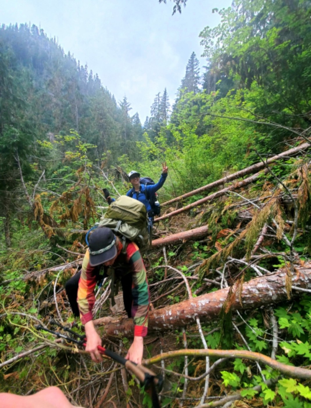 Like a previous report mentioned, most of us also drank near 5 liters of water while ascending, and there are many pumpable areas along the way. Once you're into the steeper ascent, there's ~20 very sappy trees down across the trail to get up/over/around, and several ground wasp nests on trail-- one is labeled. Two party members got stung and they had to run with their heavy packs to escape the swarm. You also might consider the size of your dog before signing them up for ambling over fallen vegetation. Can you comfortably and repeatedly lift them up 3' or can they easily jump that height on their own? Our ascent took 8 hours and the descent took 5.