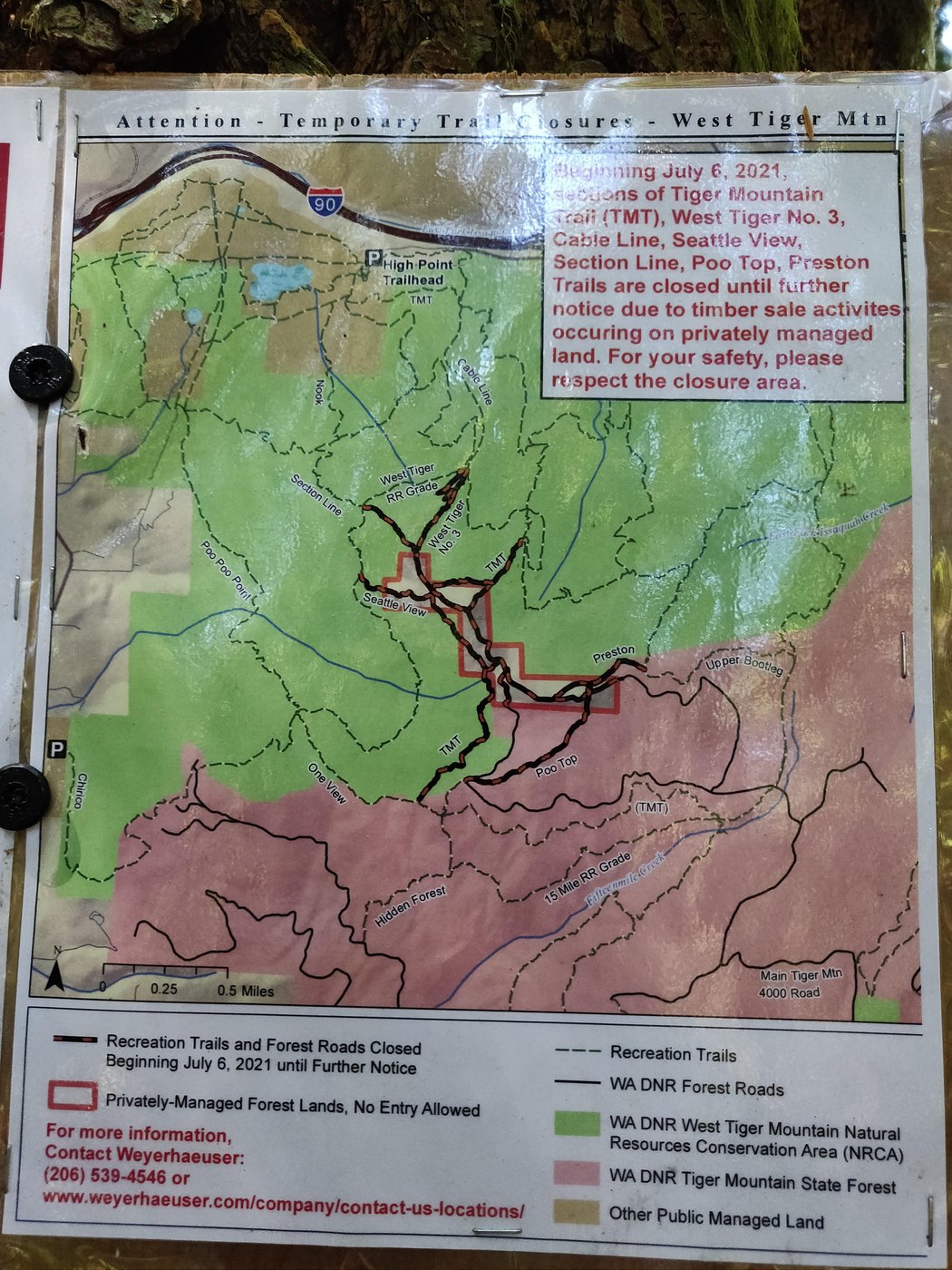 As has been commented upon by many others, the tops of West Tiger 3, West Tiger 2, and West Tiger 1 are closed due to logging activities. The logging is taking place on land owned by the Weyerhaeuser Company. For a map of the closure areas see the map above. For further information on the logging follow the link below.