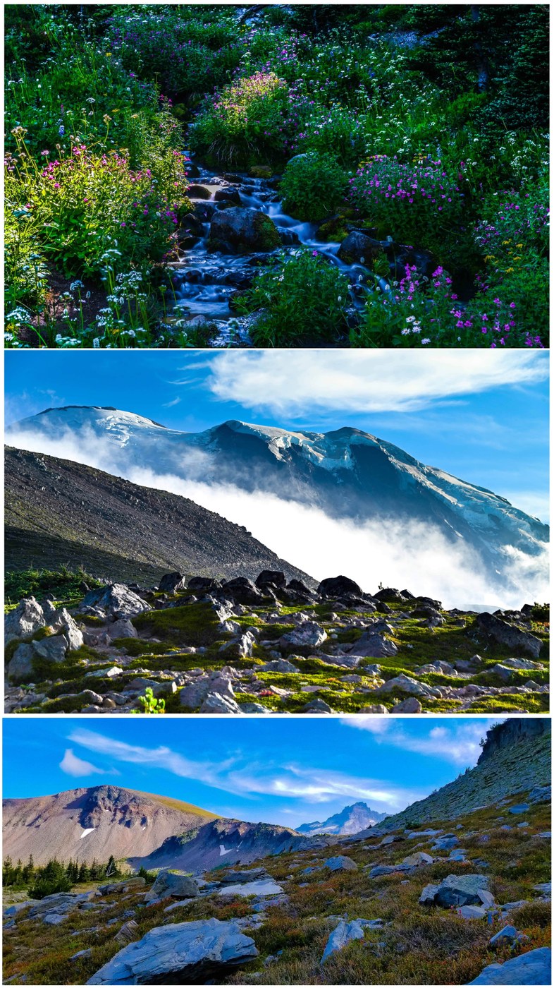 I had never taken the junction towards Berkeley Park before. I first headed down into Berkeley Park, and then backtracked to the Wonderland Trail junction to head towards Skyscraper Pass, and ultimately the boot path up Skyscraper Mountain. Flowers were quite variable: pretty much past in Sunrise meadows quite unlike my Burroughs trip report, and then prolific in spots along Sourdough Ridge trail, down in shaded and wet areas of Berkeley Park, and on the ascent to Skyscraper Pass. The final ascent up to Skyscraper Mountain was filled with heather and succulents, similar to the trail up to Echo Rock from Spray Park. The summit of Skyscraper is small - luckily I was the only person up there. I was less lucky with the view - the marine layer came in just as I summited. The trail both down into Berkeley Park, and from the Berkeley Park junction to Skyscraper Pass is stunning, teaming with marmots and butterflies. While the flowers on sun-filled slopes were mainly past, I could see from the remnants that the earlier flower show must have been amazing. The views are wide open with near and distant green meadows - this whole area seems prime for wildlife viewing with some binoculars. Yes, there are hints of fall color now... I could not help but feel sad about that! There are also interesting backside views of the Burroughs with Rainier as a backdrop, as well as a view of the (huge) Grand Park.