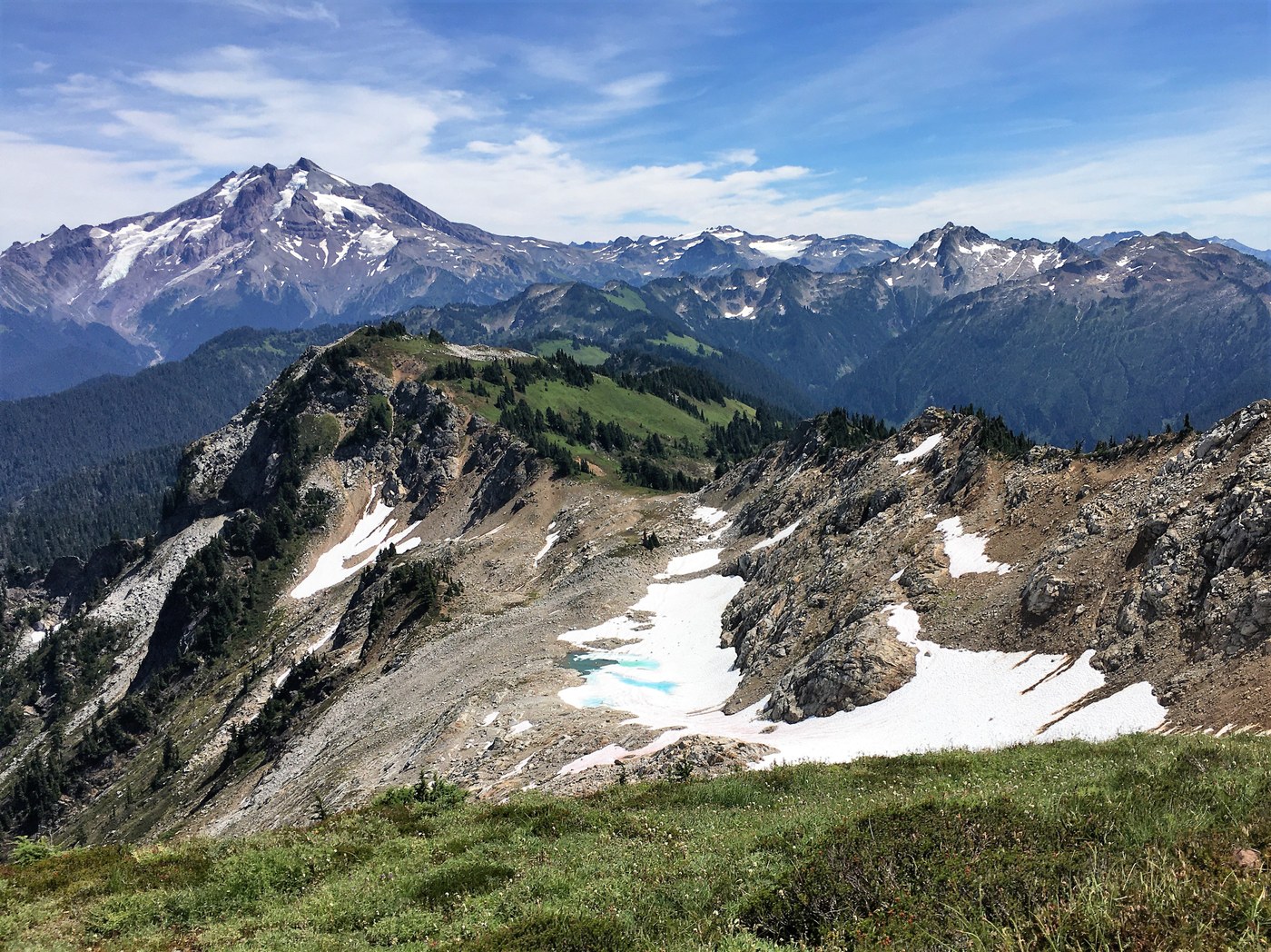 Breccia Peak has some excellent 360 degree views. Glacier, Sloan, Bedal, Pugh, and Whitechuck are all so close. Del Campo, Vesper, and Three Fingers are pretty close too. You could also see Baker, Shuskin, Eldorado, Bonanza, Stuart, Daniel, Hinman, among others!! So many peaks, so little time! Haha!! When I was on top of Breccia, I saw a lot of smoke coming from it appeared somewhere south of I90. Smoke was billowing up behind Hinman from my angle.