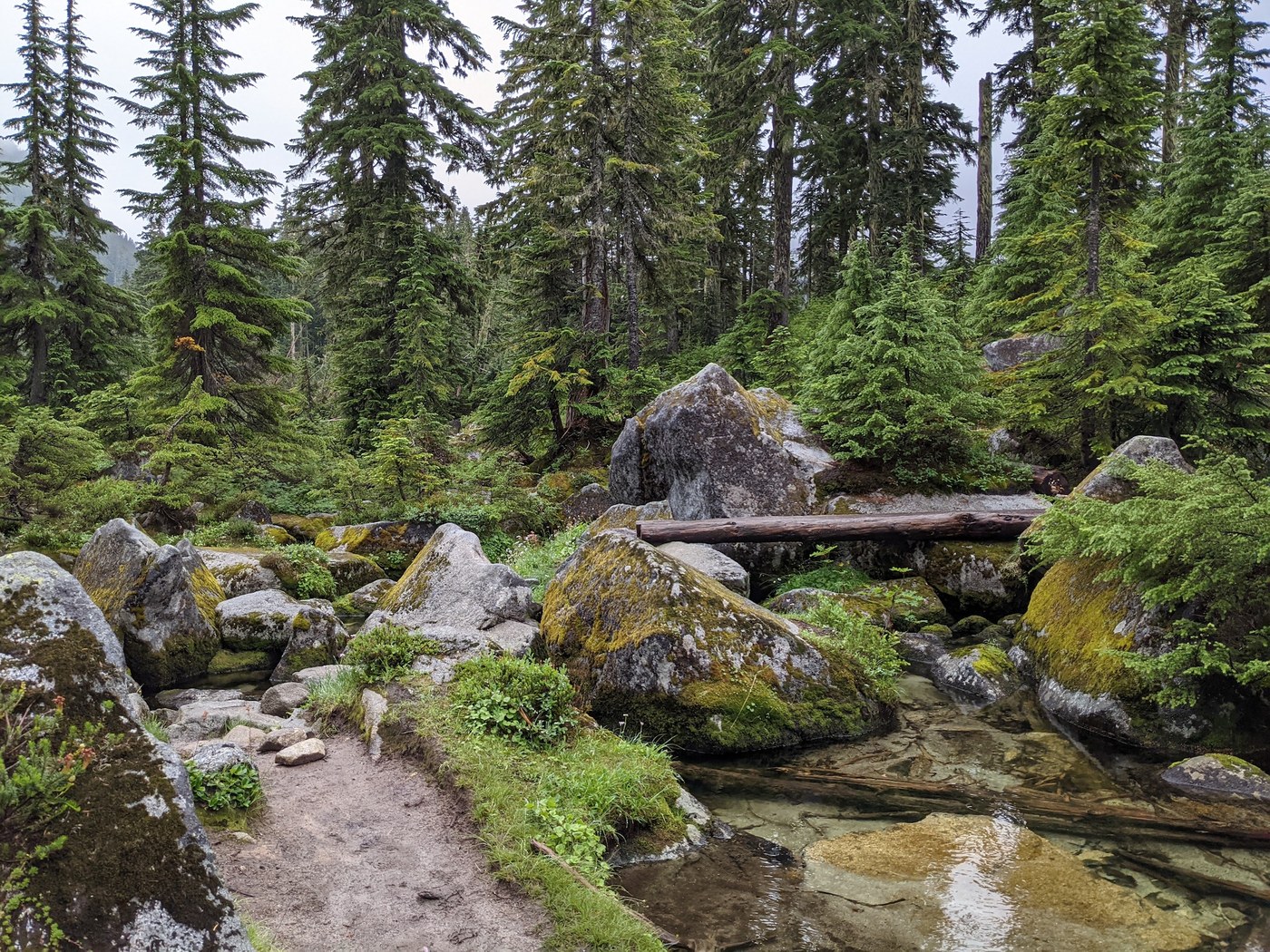 It was a relatively cool day, but here it was even cooler. The trail winds along the creek, almost overgrown at places, with wet leaves. I found a few salmon berries, but not many. At 3.9 miles the trail forks, the lake is to the right. There is a place that looks like a Japanese tea garden, where I lost the trail for a bit - I turned left where I should have turned right over a short log over the creek, but I found the trail again, along the lake. Here the trail is partially blocked by fallen trees from the avalanche as mentioned in other trip reports, and you have to either climb over or crawl under them.