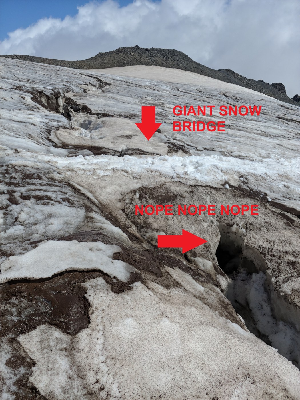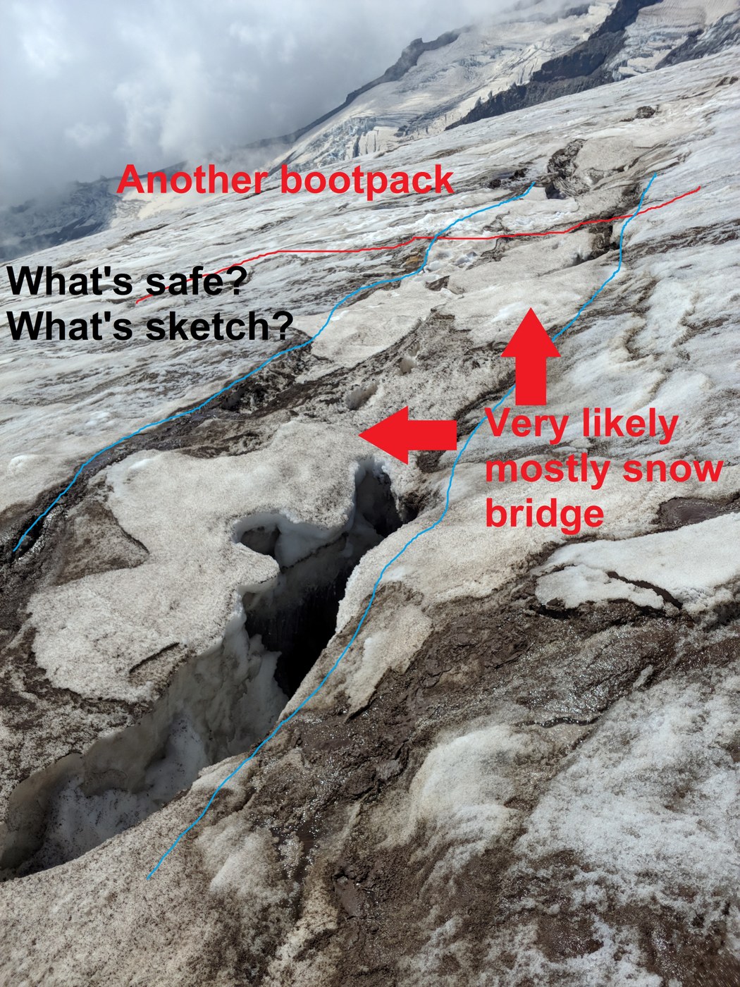 Trekking pole probing on basically every snow bridge went straight through up to the handle. We were just day tripping to Muir so we didn't have a rope, harnesses or any climbing gear and we didn't feel comfortable rolling the dice on those bridges unroped. I've happily roped up on tamer glaciers than this, and we talked to a half dozen people at Muir who were all sketched out by the crevasse crossings. It was basically glacier soloing, nobody we saw roped up (including a few guide groups). Have a talk with your group (or yourself) about your acceptable risk tolerance just for a day trip to Muir. If you're doing the DC, consider using your glacier gear (and judgment) approaching Muir. Practice is good, right?