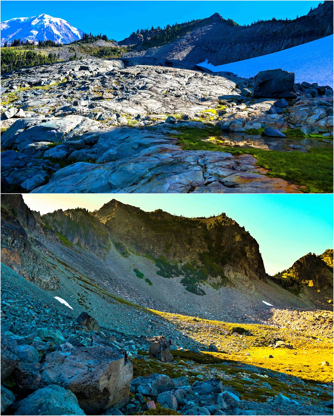 The route has rockfall potential - you might consider a helmet. Certainly, poles are recommended. I prefer to use just one to keep one hand free. This worked just fine. There is no real exposure to speak of (my buddy might not feel the same way). I did the route clockwise which guarantees you stunning views the whole way. I could not imagine why one would do counterclockwise with your back to the mountain. The views above Spray Park from the descent trail are spectacular, but really the varying terrain and views make this loop a winner on all fronts.
