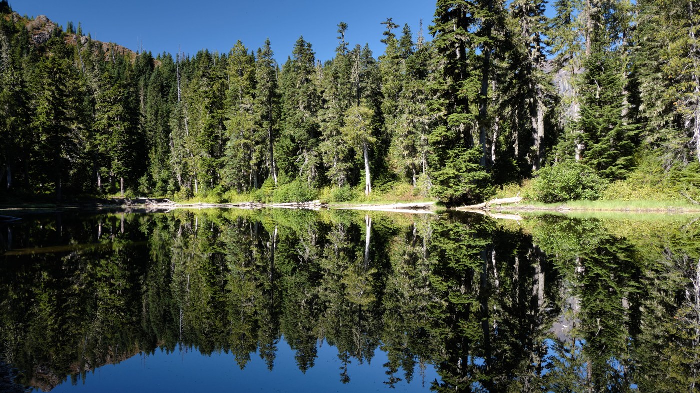 Shortly after the shelter, the trail crosses the bridge over the creek and the steep climbing begins. Eventually you make your way to the first lake (which I discounted as a lake when I first passed it) and then the second, Harrison. Neither was particularly impressive, the former was small and looked quite stagnant, the latter much larger but not very inviting. I paused to take a reflection photo and then carried on to the top.