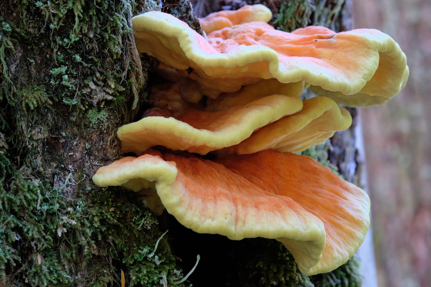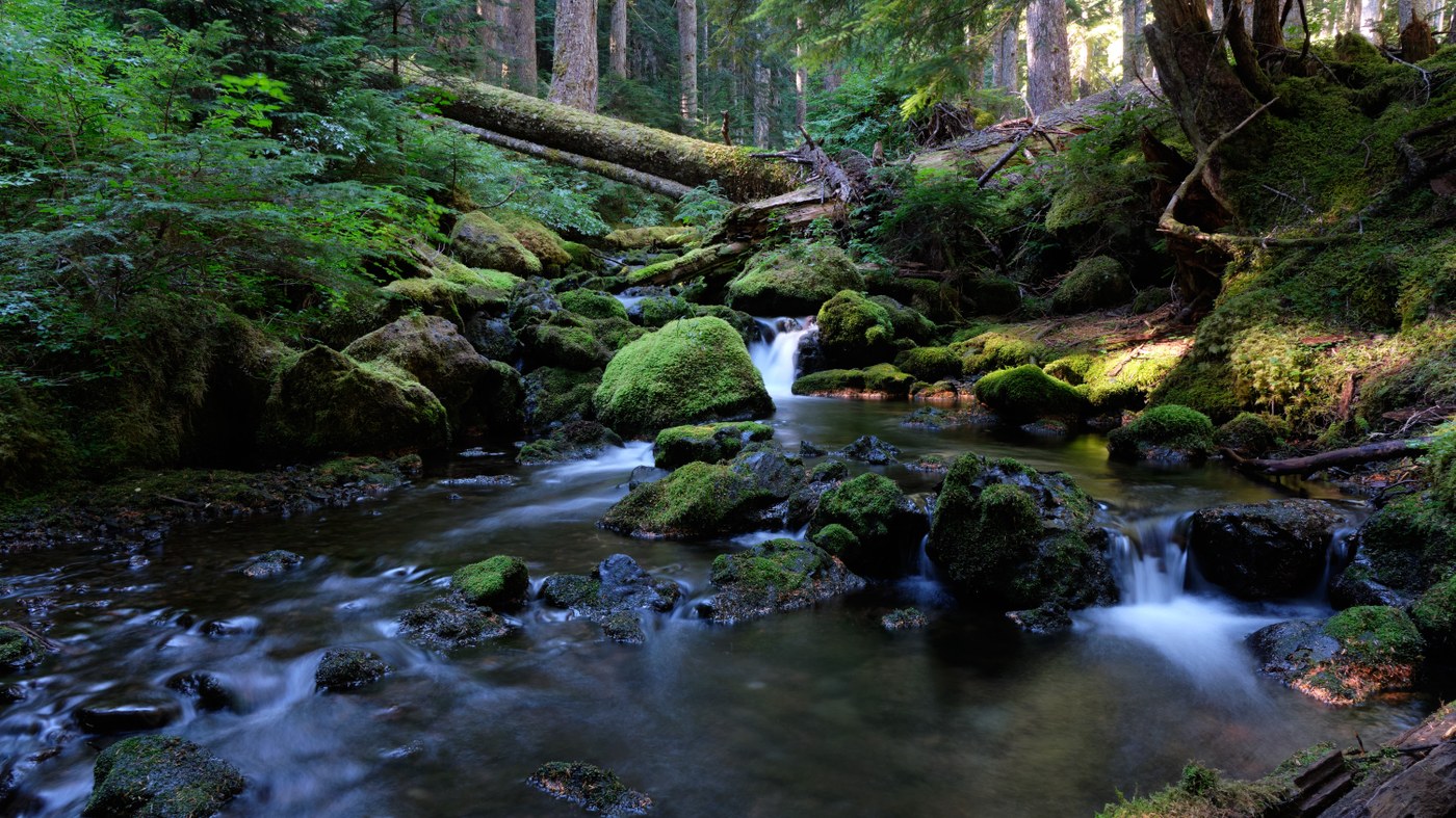 The trail is typical of many Olympics trails, though less steep than most until you reach the foot bridge over Tunnel Creek. On this very sunny day, the light in the forest was wonderful and I took the opportunity to photograph many small plants and numerous small waterfalls. Mushrooms dotted the trail, in particular two different trees had impressive chicken-of-the-woods mushrooms with their bright orange color lighting up the green forest.