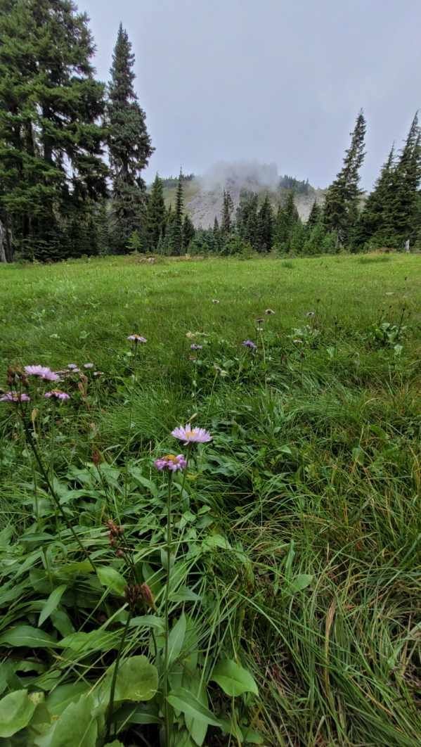 It was a cooler day with some clouds but a nice break from the super hot days we've had, perfect for hiking. I overheat easily (my DNA puts me in the foggy hills of Scotland) as do my siblings. The TH starts from the Mowich Lake "campground" which looks like a parking lot, it lacks everything I appreciate about camping, but I digress. The trail is in good shape, you descend for a mile or so (?) before you encounter steps, lots of steps, up and down, through a tranquil forest. There are few water crossings, impressive water volume in two of them. Eventually you hit the final ascent, switchbacks with steep, rocky trail but uphill is quite doable, it's the descent that poles are definitely beneficial for old hikers with original knees. Crossed paths with a number of hikers on multi-day treks, enjoy talking with them and getting their stories and experiences. Hikers love to talk about hiking. Met a dad with his 10-month old daughter Lucy who was smiles from ear-to-ear. Met a solo hiker finishing up a 5-day trek, she had good experiences to share. Met another solo hiker just starting a 96-mile trek who appeared to be almost as old, with knees double-taped and wrapped. Met 3 young women on a 6-day trek (3 days into it) on a figure eight route. Once we arrived at the "top" to gorgeous meadows, streams, peaks, and wildflowers on their way out, it was worth the steep, rocky mile or two. The sun was not at it's best but it was a perfect PNW day with a few low clouds dancing across Hessong Rock and Fay Peak. Never saw Tahoma because of the low clouds. Found a large rock formation to rest and eat. Hikers continued to pass by from multiple points of entry. Lots of happy hikers. This is a beautiful hike and even with the number of hikers we met, it never seemed crowded at all. Tracked 8.2 miles with 2,300' EG. Arrived back at Mowich "campground" just as the rain started. The "campground" had become wall-to-wall tents. Apparently there was a running event that brought many participants to the "campground". It was comforting getting into a dry and warm truck! I felt bad for those trying to stay dry in their tents, but we all live here because we love the rain, right? Great hike, put it on your list.