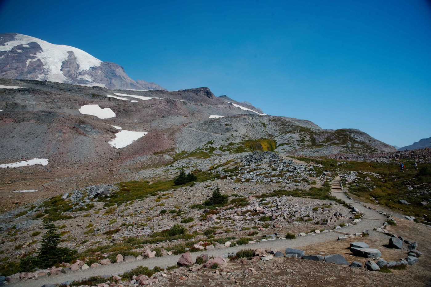 At this point the mountain was so close I felt like I could reach out and touch it. Sunrise had offered more photogenic frames and a more pleasant north side of the mountain, but this trail was closer - and I had little idea we'd soon practically be on part of the mountain. I mentioned to my wife that I thought we were seeing climbers going up the mountain. She corrected me and said she thought that was the trail, and as it turns out, she was right. We worked our way to another view before following in the path of these "climbers" up a long ascent along the side of another level of the mountain.