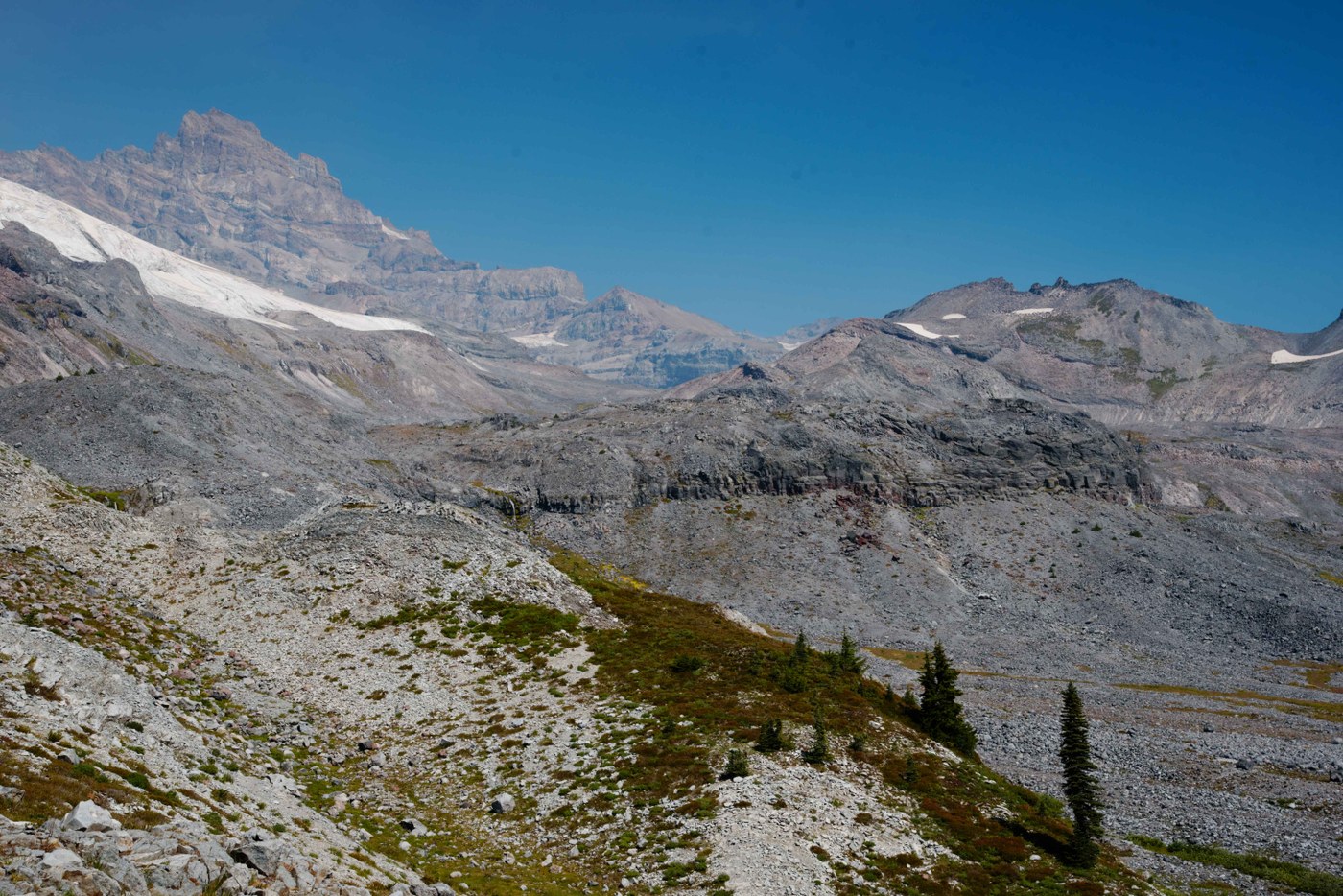 By this point the trail had become quite busy. Every time I stepped out of line to take a picture or something, getting back on the trail was like merging into interstate traffic. We'd soon start navigating switchbacks down on a rocky path, and when the trail finally started to level out it was a mix of rock and grass. The upcoming section of trail was no less interesting than what had come before, as we began to navigate the spine of a ridge that offered nearly continuous good views of the Tatoosh Range ahead. Creeks tumbled over the side to form waterfalls. Still in a mix of moonscape, the trail dipped down into a wide flat area where multiple creeks joined and were bridged, with a great view of Little Tahoma in the distance. This was a special spot along the trail.