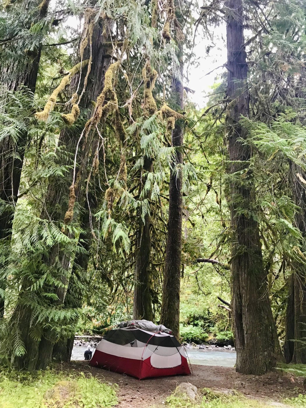 The trail passes a lovely waterfall to the left and steep cliffs to the right as it heads up a little more past a bend in the river. A little further up, you'll hit unsigned Dosewallips campground at the horse hitch. It is a lovely, flat area with TONS of campsites. It's super-cool to see how nature has started to reclaim many of the picnic tables that appear to have gone unused for years. There are probably a dozen flat riverfront campsites, half of them out in the open and the other half with forest surrounding for more privacy. Plenty of flat spots through the meadow as well. The river water has a blueish/turquoise hue at times, which is gorgeous. The trees, many appear to be large old-growth, are lush with moss and hanging moss both evergreen and deciduous. The facilities as well as the pit toilet appeared to be in disrepair, so you should plan on digging a hole for waste. Bear lockers are prominent, although we brought our bear canister just in case. No sign of wildlife other than squirrels and chipmunks while we were there.