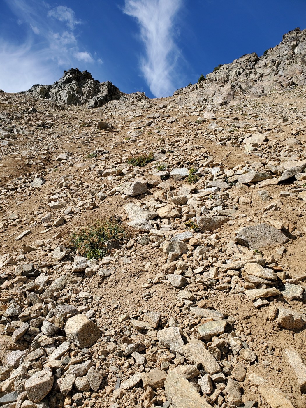 - The first few steps down from the ridge into the saddle are terrifying. Attached a photo showing the slope angle and dirt/rocks.