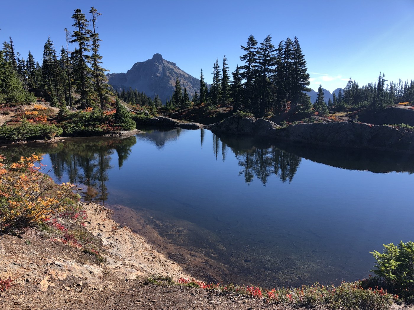 Both dogs woke us up for sunrise and were ultimately too excited to settle down in the tent after going out in the morning, and as a result we got an earlier than usual start on the day. Breakfast and coffee by the lake and then we started up the trail to Rampart lakes. This was a decently steep climb up and we were both happy to be doing it without full packs. Even more gorgeous views of Rachel Lake and fall colors. We made it up to Rampart Lakes and the gorgeous views continued. Spent an hour or more roaming the trails and sitting by the larger lake. This area reminds me of mini-Enchantments. There was one great campsite and a couple other campsites as well. They are definitely more dispersed and less obvious than the ones at Rachel Lake, which could be perfect, or could be frustrating if you are getting there late or last. Went exploring the hill by the larger lake, and saw many birds up there and 2-3 signs for the toilet, but no actual toilet. I am not sure if there still is one up there or if it was removed. (Anyone know?)