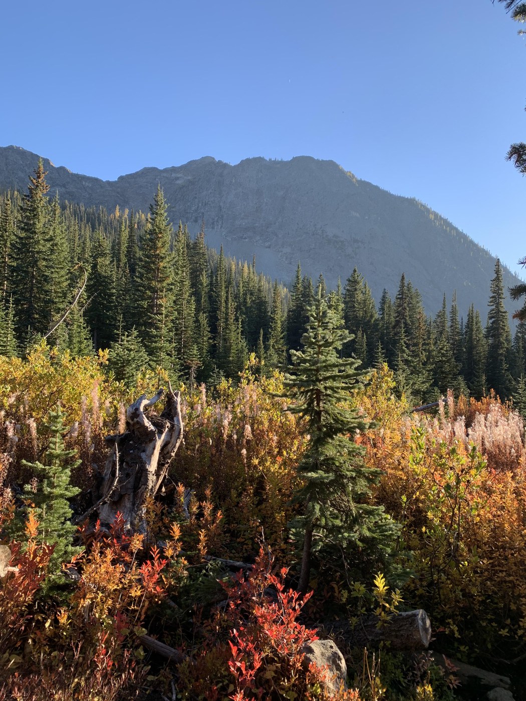 The day was absolutely stunning with temps in the high 60s, low 70s (I think -- no cell service). The larches are really just beginning to turn (we saw better larch foliage on the Blue Lake trail the day prior) but the foliage from other plants/trees made this a worthy hike. We did the side trail to Lake Ann -- a little less crowded. We are slightly older hikers so were very happy to have had my poles for the decent from Maple Pass.