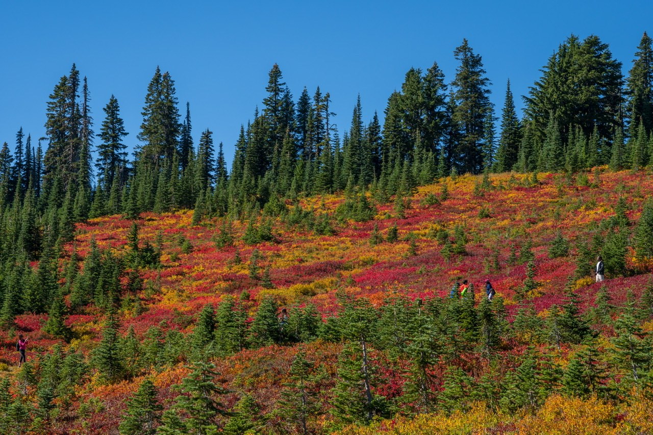 We started hiking at about 7:20AM, already plenty of cars in the lot at that point. Taking the Deadhorse Creek trail meant on our way uphill we were mostly alone (saw maybe 3 or 4 others?). When we could see many people on the Skyline trail when it was visible. As the day got later, the trails got much busier. Lots of people at Panorama Point by the time we arrived, and a line to use the toilet.