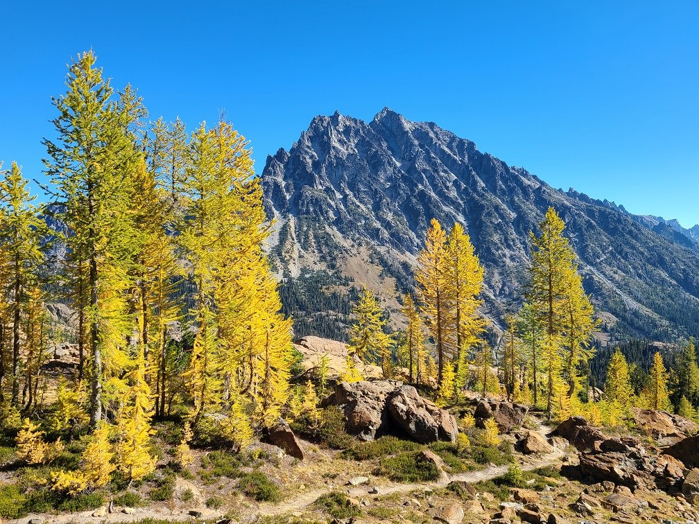 The larches are just turning - I'd guess in about 1-2 weeks they'll be at their peak. But they were still stunning and made the long drive worth it. The last half mile or so to the lake is a bit tricky to navigate - follow the cairns. You will likely have to do some mild rock scrambling to get up there. The lake is absolutely gorgeous with Mt. Stuart in the backdrop. There's plenty of space to have lunch/snack/rest right where the trail meets the lake, but I recommend going around the lake to the opposite side (where you meet up with the trail to Longs Pass). Rock scrambling required to get around.