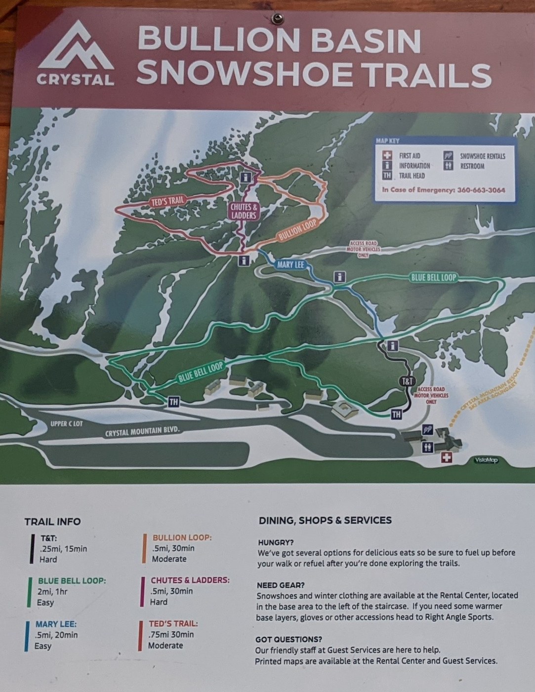 - I followed signs for Bullion Basin Trail #1156 through a couple of signed intersections, then arrived at a four-way intersection with a kiosk describing the Bullion Basin Snowshoe Trails. Any of the named trails will take you towards the PCT, but I opted for Ted's Trail. Ted's Trail had a lot more smooth tread and was moderate grade.