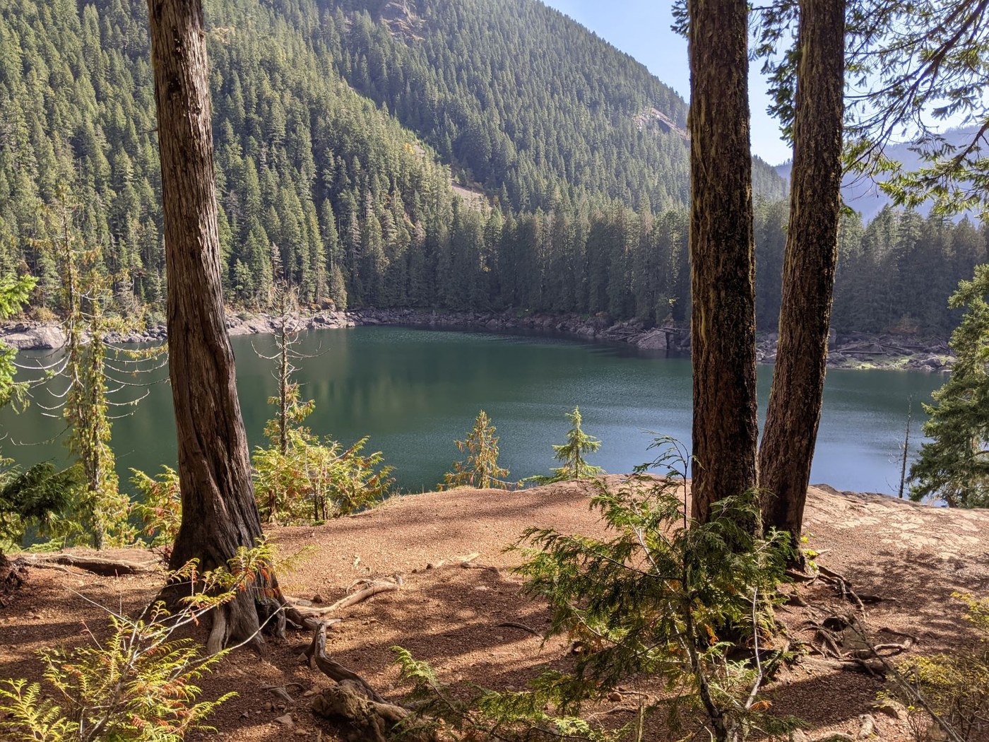 We followed the advice on the WTA guide to go left at the intersection of Upper Lena Lake trail for a better view of the lake. It goes up for another 0.5 miles when you find the next intersection to descend to the lake on your right. This section is a little blown down by a couple of downed trees but it provides a closer look at the creek with some beautiful old growth trees. You will hit the campground and get a full view of the lake.