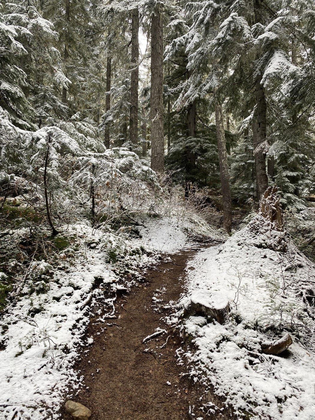 The trail is in good condition with the exception of compact snow on the trail. We did not use our micropikes but there were a few sections that it would have been helpful to put them on... if this trail sees any more snow though it will quickly become necessary due to the steepness of the upper half. I felt that this trail was easier than i had expected because of the constant switchbacks which cut the intensity of the pitch, but still quite the difficult trail! The bottom half is mostly muddy dirt trail through forest with the occasional stream crossings, but the upper half is all rock and shale so it can be difficult on your feet and ankles. Regardless, the views are wonderful on a clear day once you get to the pass so it's all worth it! The larches are fading and partially covered in snow so they were not the highlight of the hike, so don't expect much for fall color as it is all now covered in a blanket of white.