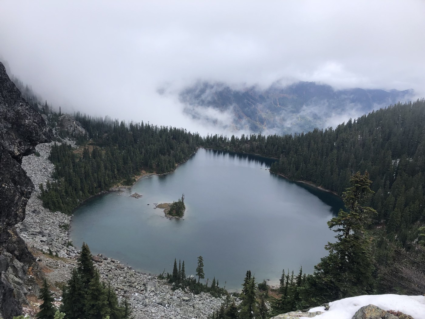 Got to the trailhead around 12:40pm - there is no real parking lot, just along the road. Road has a few potholes, but overall should be pretty doable in any car. We were the 3rd car and only saw 3 other groups the whole day. There is no privy at this trail or Lake Valhalla, so would recommend using the public bathroom at Stevens Pass. Trail starts off with a decent climb, getting steepest just before the wilderness boundary. After the wilderness boundary, the second half gradually becomes flatter and goes much faster. Arrived at the lake after about 1-1.5 hours and it was too foggy to even see across. Very pretty and the fog cleared a little as we took a break. Some snow on the trail around the lake and probably the last half mile or so to the lake. Had spikes, but did not need them. Had a trekking pole, which was used a lot during the climb up and down, but not essential.