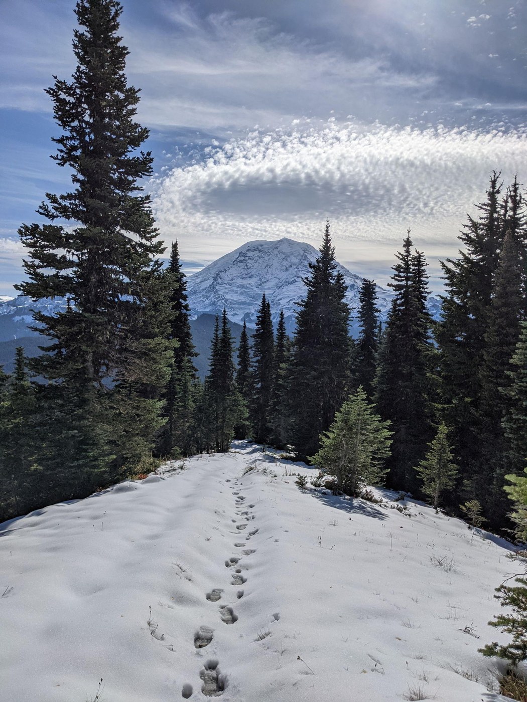 The views are especially good along most of the Bearhead Mountain spur. It was a truly gorgeous day, bright and warm and sunny, making the snow seem beautiful and magical instead of treacherous. I enjoyed this portion of the trail the most. I was surprised at how close Rainier looked, given that this trail is outside the national park. I also appreciated that it was angle of Rainier I don't normally see.