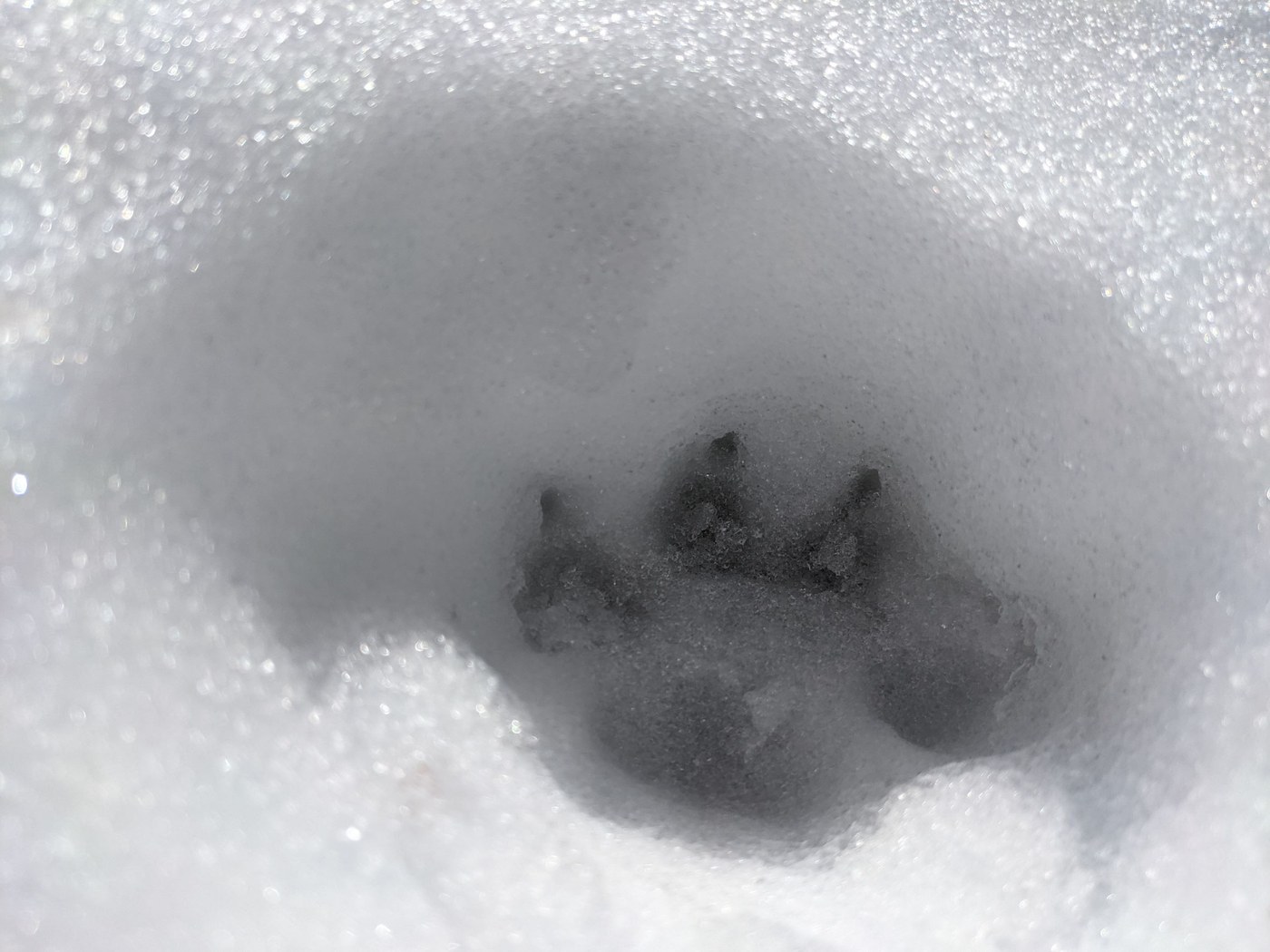 Not long after turning left for Bearhead Mountain, the snow went from intermittent to continuous. At the first switchback, I could see where folks before me had decided to turn around. After that, the only prints I saw were from wildlife. I found the trail surprisingly easy to follow given the deep snow (at least 6 inches deep in the open, over a foot at the summit), and only used Gaia to confirm what was already obvious. Even though I had to break trail all the way up, in some ways it was easier than slipping and sliding along the traverse.