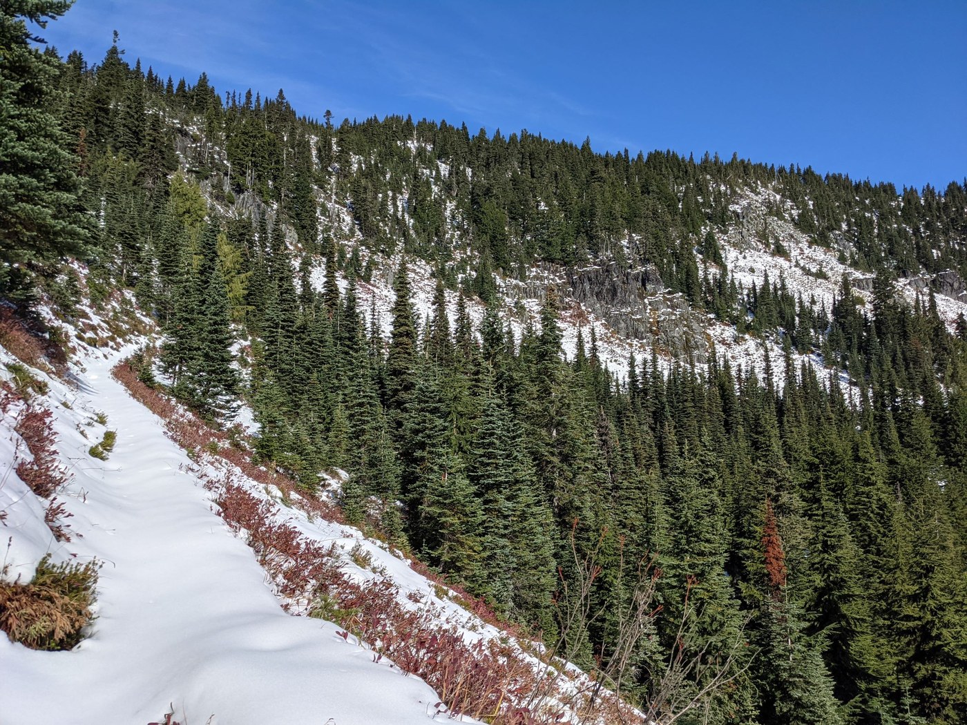 On the way up, I saw three parties, two of them hunters coming down on the Carbon River trail (based on the lack of tracks, they must not have headed up to Bearhead). Those were the only parties I saw until I got back to the junction with the Summit Lake trail at Twin Lake, at which point the trail was moderately popular with folks headed up. The pups I met on trail were polite, I found two piles of unbagged poop at the trailhead at the start of the day.