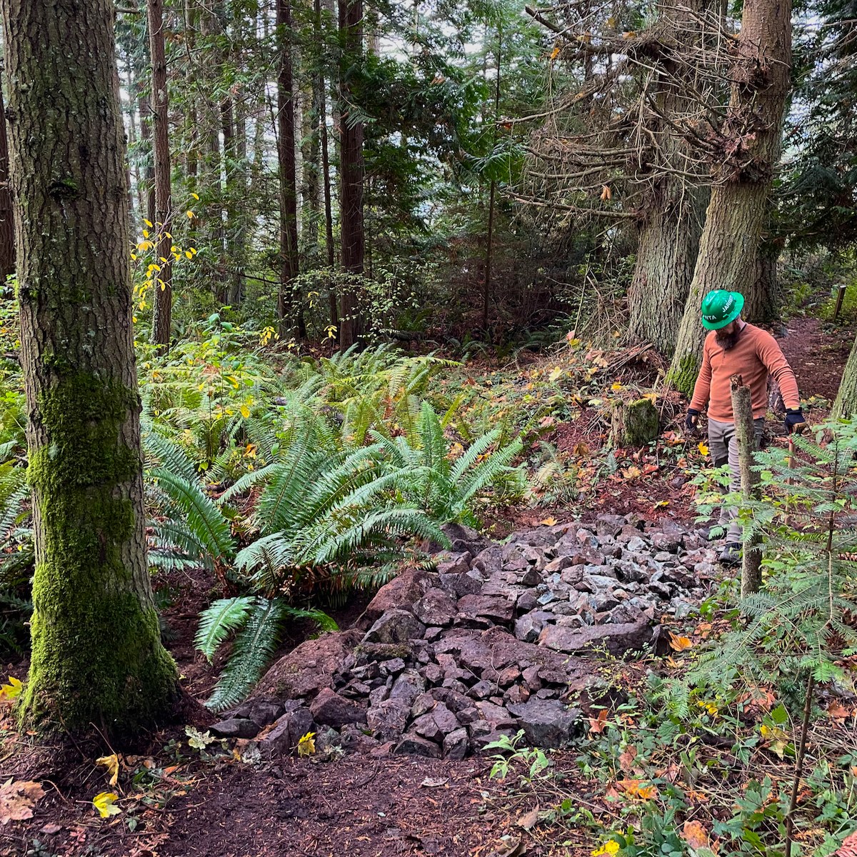 I spent the day out on this trail with a great group of volunteers, building some fantastic, new, trail structures to help improve the hiking experience as well as protecting the trail and surrounding landscape against erosion. Our group was split up into four, smaller pieces, each one working on a section of trail that involved building rock walls, filling the raised trail bench with crushed rock, capping the whole thing with high quality mineral soil, and finally doing some site improvements, including transplanting sword ferns. It was a great day that included safety, fun, and some high quality work from everyone involved!
