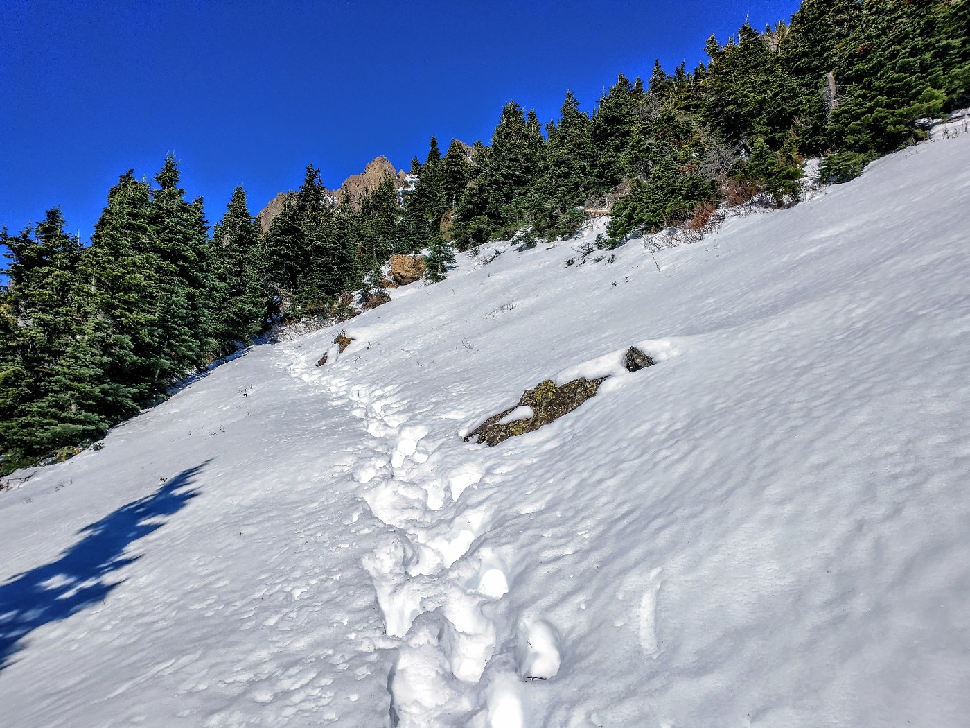 The trail from the upper starts out steep and never really lets up. From the head to where the snow starts the trail is in great condition. Surprising with some of the wind we've had as of late. For now, intermittent snow and ice start as you break from the treeline. As you reach closer to the top there's 2-4' of snow in most sections. Gaiters would have been nice. At ~400' from the top, the boot path veers left and involves some bushwhacking. I and most went this way to avoid crossing a "gully" without an axe. As the day wore on it did get pretty slushy. Poles were a big help with this.