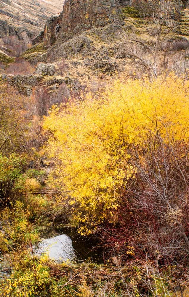 I took what turned out to be an afternoon walk in Umtanum Canyon on this very cool, dreary day. I walked up to the big buttress on the south side of the canyon between the first & second crossings of the creek. I took some loppers with me and cut back some of the vegetation that was crowding the trail & causing people to start to beat in alternative trails. Hopefully they will keep to the main trail in these spots now, but we'll see. I was hoping that all the aspen suckers would be putting on a good show of yellow, but they didn't seem much different from when I was here two and a half weeks ago. I am wondering if many of them just go from green to brown. Most of the leaves of the cottonwoods & aspen and many of the shrubs were gone, but the grasses were golden and the willows were still putting on a good show. I didn't see any wildlife or other hikers.