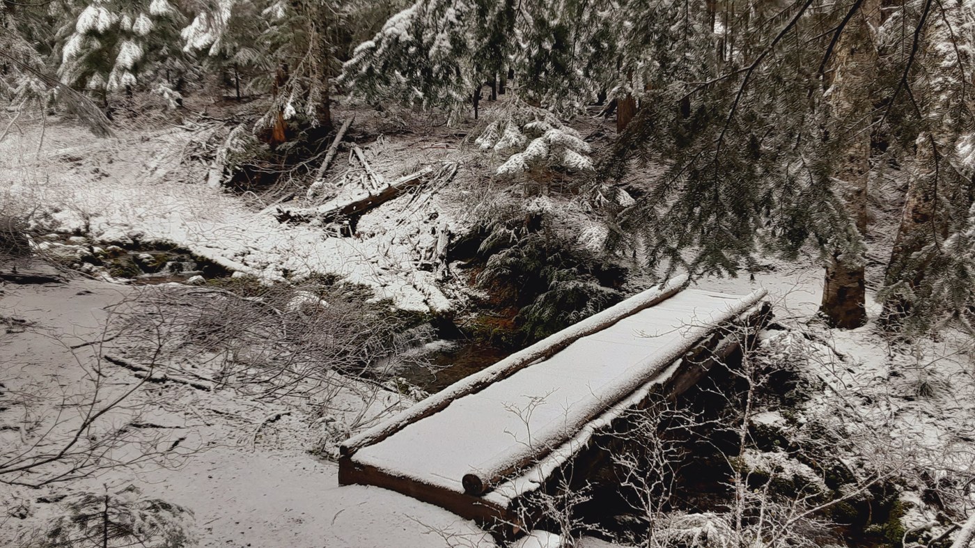 We arrived at Longmire a little after 9 a.m. - we were initially told the gate would probably be open around 10 a.m., but after checking in at 10 a.m. were told maybe more like 11 a.m. given how much snow they needed to plow. Know they were doing good work but we were ready to get outside. We decided not to wait for the gate and headed back to Kautz Creek to take the trail toward Indian Henry's Hunting Ground for as long as we were having a good time!