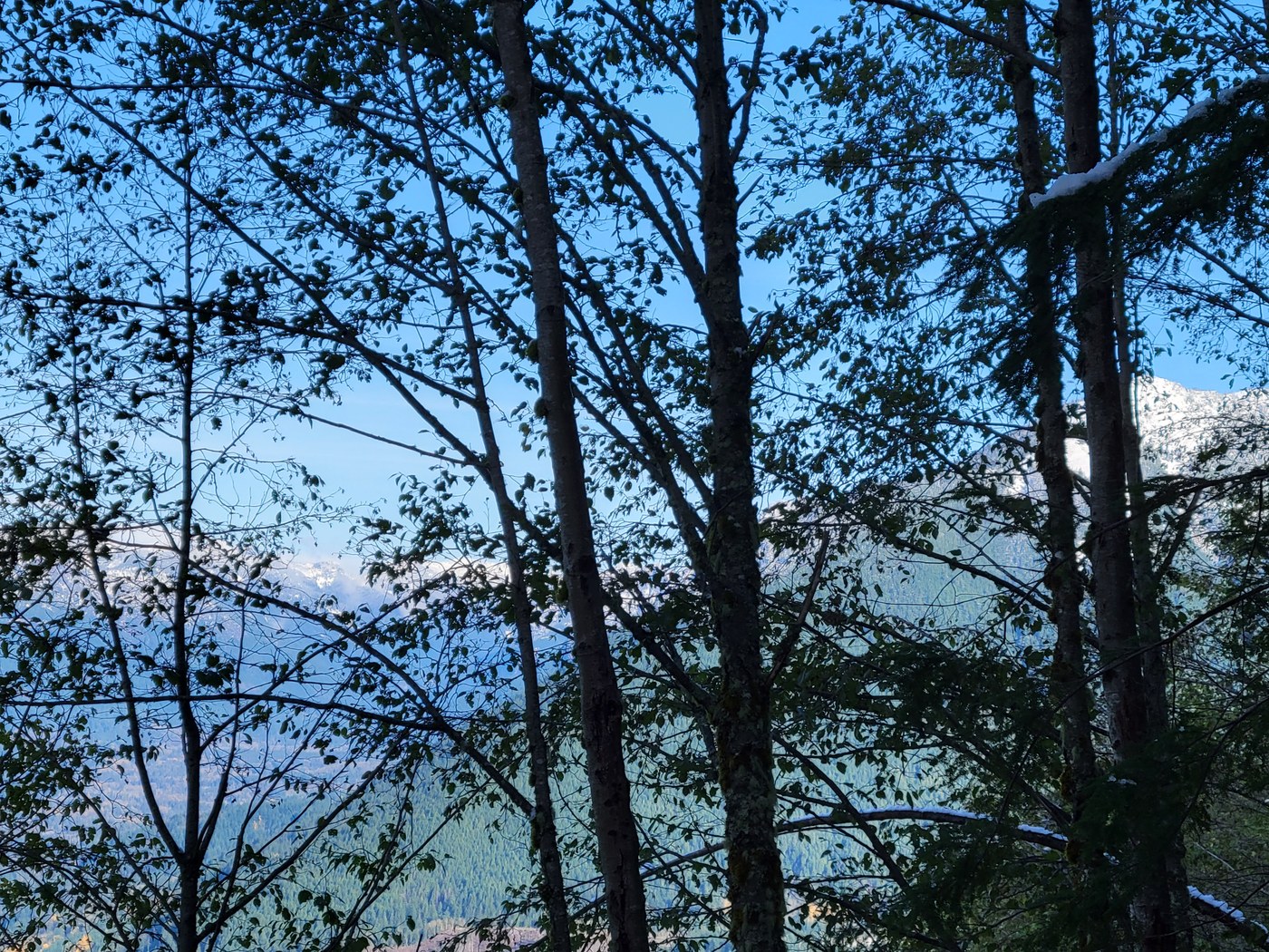 The terrain and views: you are hiking through second growth forest, much of which comprises the watershed for Seattle (Cedar River Watershed). I find the forest here much nicer/healthier than that on Rattlesnake Mountain. Lots of cedar, Doug fir, alders up top, lovely ferns throughout. The first and third viewpoints have pleasant views. The first looks towards Mt. Si and over the Snoqualmie Valley and North Bend area, the third has two hand-hewn benches and has views across the valley to Middle Fork Snoqualmie's peaks--dusted with snow and gorgeous on this clear, almost-sunny day. We gained over 2000 feet of elevation, as far as I can figure. Saw four people--one hiker (old guy, like us. Love seeing Wrinklies on the trail!) and three bikers. Great to be out in the season's first snows. Happy hiking, Everyone!