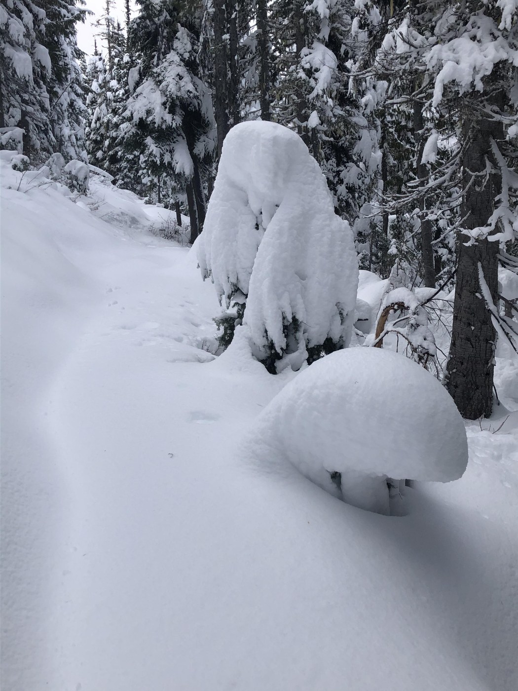 Only one spot had a blowdown mash-up, with two larger uprooted conifers and several other smaller trees, but didn’t cause me to lose sight of the trail. Depth increased to 16-18” at Squaw Lake (time for a name-change), my turnaround point just two hours up. Frozen and serene.