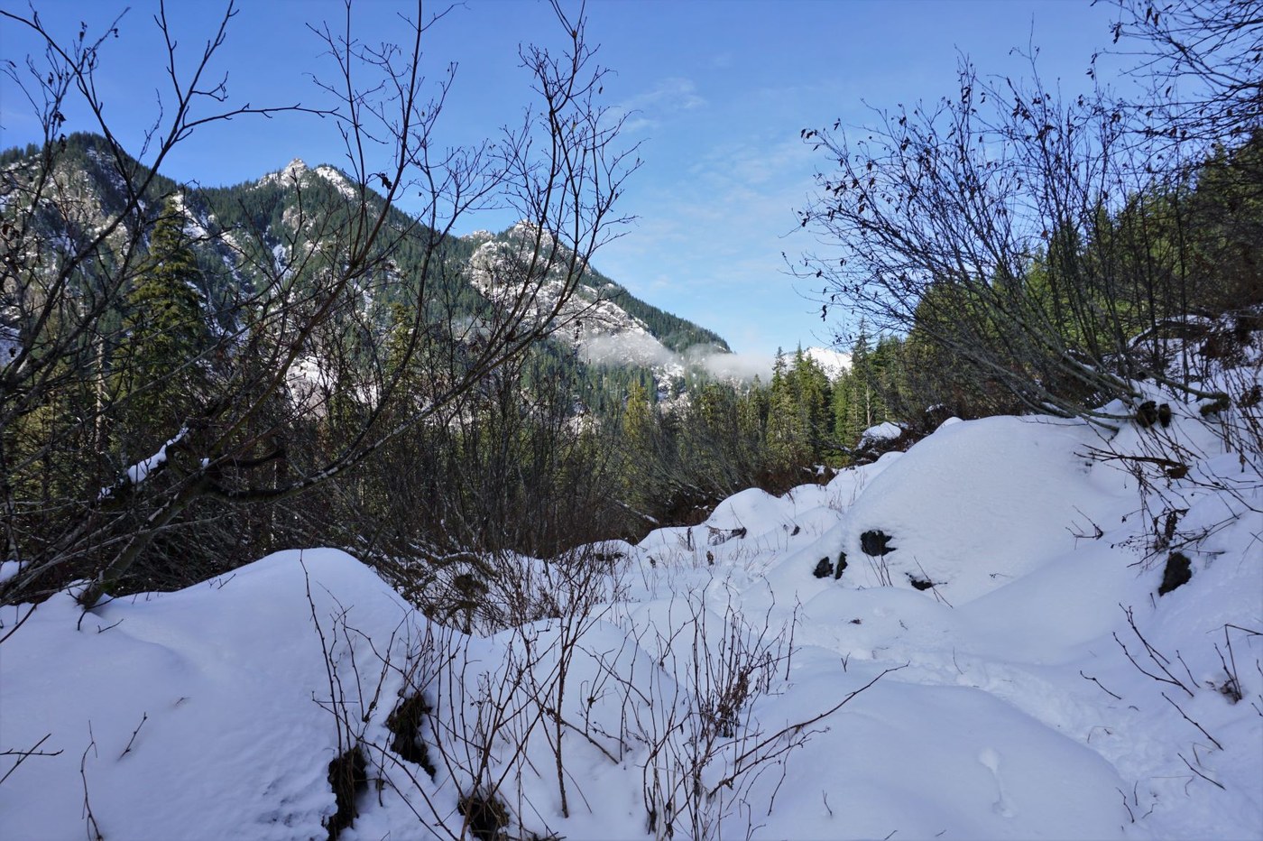 Taking advantage of a sunny day at the pass and that short window of time after the first snows but before avalanche risks increase we spent a few hours hiking up the Gold Creek Valley. Sno Pass parking is not yet required and you can still drive the forest road to the summer trail head close to the pond, but the road is fully covered in compact ice and snow. There are plenty of gnarly pot holes to deal with on the way in and some folks were parking at the end of the forest road and hiking up so watch for pedestrians too. The black top from the I90 exit had no snow - but that will soon change with the next storm as will the avalanche risk of the valley trail.