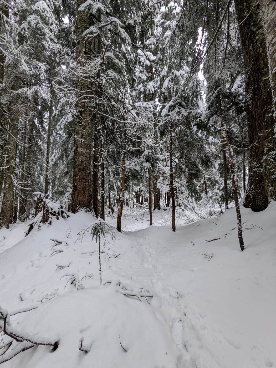 Awkward time of year to do this it turns out as the trail is hard to follow under all the snow but it's not deep enough to just snowshoe over the top of all the underbrush. Be prepared to hone your navigation skills and do some bushwhacking. Note that the blue markers seem to be the winter route and will lead you through all the brush, so aren't necessarily helpful for finding the trail besides making sure you're in the vague right area. If you try to follow our meandering tracks, enjoy the adventure :)