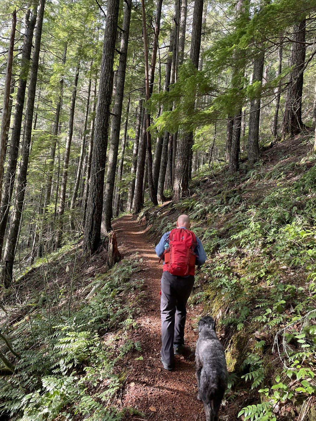 Foot traffic was light today on the Big Creek Trail at Lake Cushman. We started hiking at about 10:30 am. Warm sunshine and blue skies were breaking through. The forest was absolutely stunning. The well-manicured trail, damp from recent rains, was drying out fast as we walked our dogs in a clockwise direction up the loop trail. We headed straight to the viewpoint off the Mount Ellinor Connector trail at 2600 feet elevation. A wide bench offers a comfortable place to sit and take in the views. We fully indulged, especially after climbing steadily for 3.8 miles and 1800 feet. Even after a half hour of rest, we felt a little reluctance leaving such a pleasant spot.