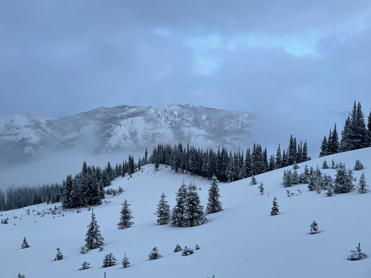 Snowshoes weren't required today. Ice axe and trekking poles highly recommended if heading for Northway Peak, along with crampons as a backup--more so for Northway Peak than Northway Notch Peak, as the latter is pretty flat. Microspikes would probably be helpful for stuff below treeline until the snow gets dense and heavy/wet.