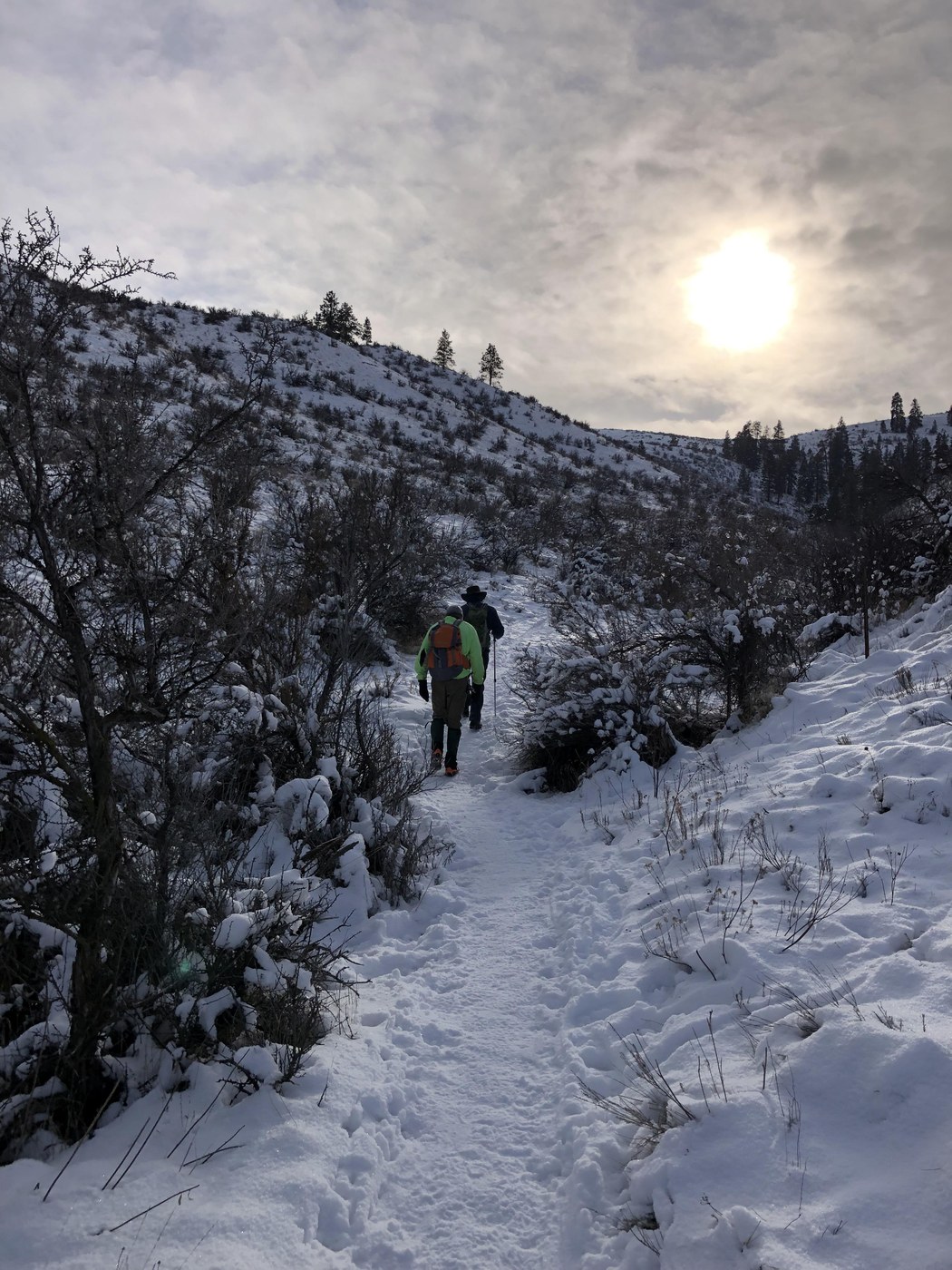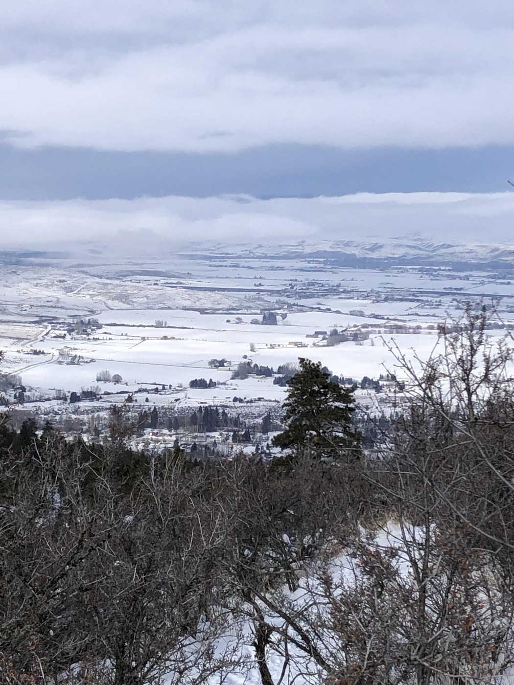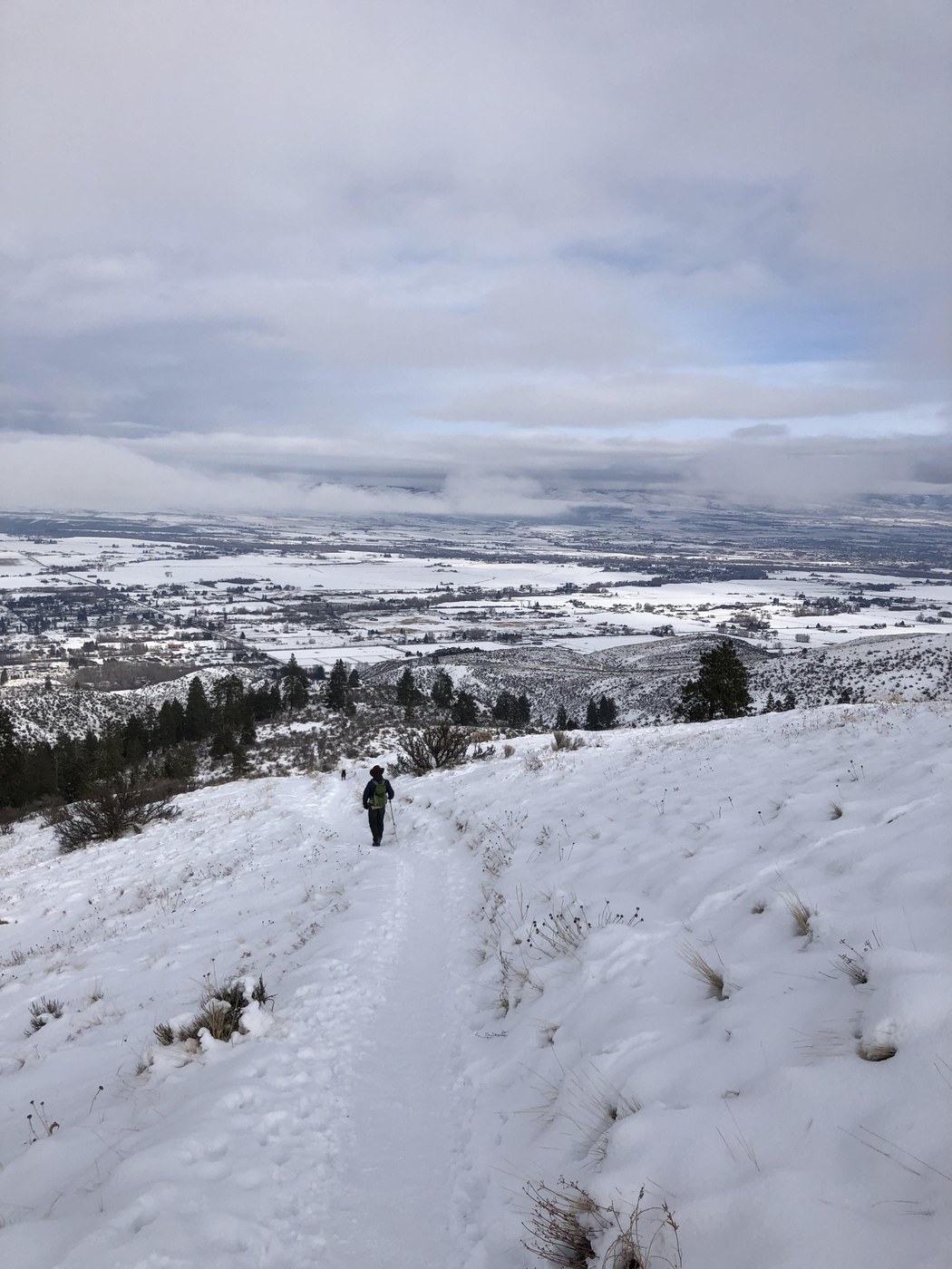 Today we hiked up the Boy Scout Trail and down the Westberg Trail. Spikes were essential and poles helpful. There is snow and ice the whole loop. Spikes make a treacherous hike enjoyable. It was about 18 degrees the whole time we were hiking and we saw about 15 other hikers. There was an overcast today, but there were still great views down to the valley and Ellensburg. This area provides very nice hiking in the pine and sagebrush biomes. There are several hikes here to explore, and in the warmer seasons, lots of mountain biking opportunities.