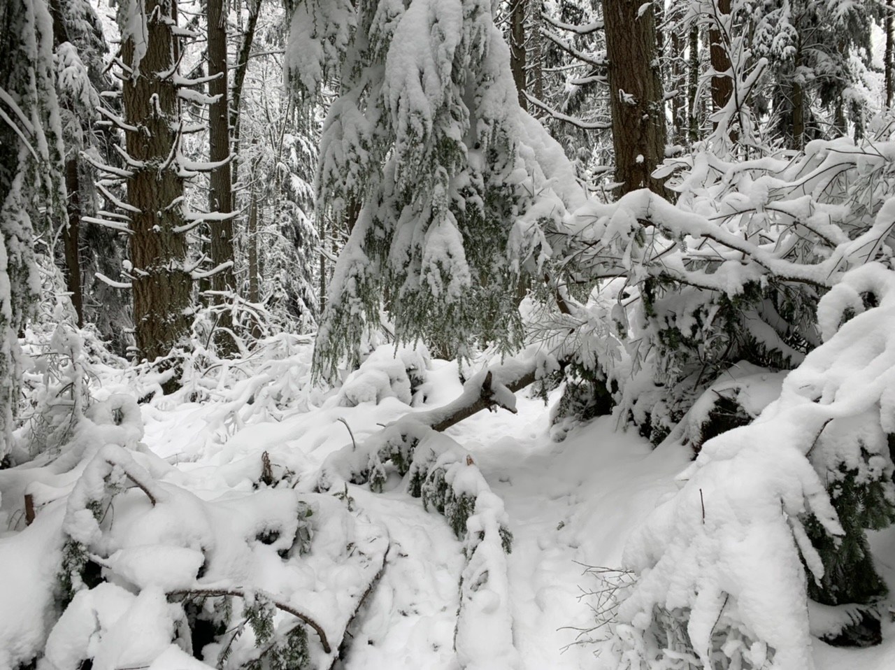Today I went on an amazing winter walk on Cougar Mtn from Sky Country TH. This was Cougar Mtn at it winters best! The snow laden trees made it a winter wonderland. I arrived just after 10:00AM and it was 24 degrees. The roads getting to Sky Country TH on Cougar Mtn are bare and wet except the right turn off Cougar Mtn Way to /Sky Country TH. It had compact snow easily drivable with AWD vehicles. I made a 5.5 mile clockwise loop following these trails: Clay Pit, Coyote Creek, Klondike Swamp, Lost Beagle, Million Dollar View, Shangri La, Tibbett’s Marsh, Harvey Manning, Cougar Pass, Clay Pit Road, East Fork Trail, Fred’s Railroad, By Pass Trail, Cave Hole and Old Man’s Trail back to Sky Country TH. Not too many folks have ventured out on the trails yet - Some of the time I followed XC ski tracks, others snowshoe tracks and other just foot steps. On two shorter sections of trails I had to break trail which was a little more challenging. The snow was the heaviest near the Million Dollar View Pagoda and the Shangri La trail. The trees are so laden with snow in places that both trees and shrubbery touched the ground. I would estimate I had to bend over 40+ times to scoot under low branches and easily step over or walk around 10+ downed trees. I just tallied that up to the fun of walking in the snow. More wildlife sightings than usual today - juncos, wrens, towhees, chickadees and a Douglas squirrel.
