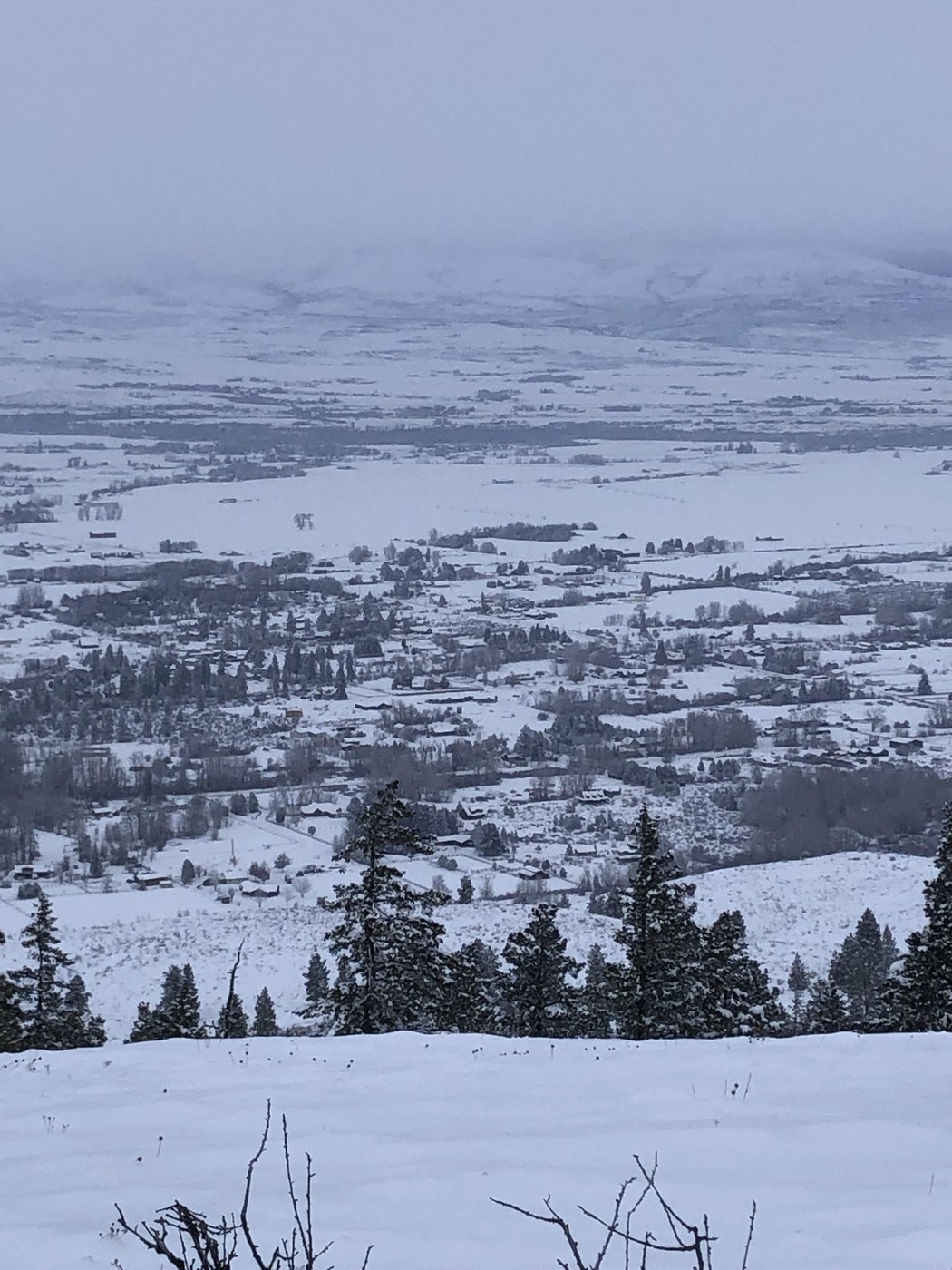 Today, we didn’t really snowshoe up the Boy Scout Trail, but went up it for just maybe a quarter mile or so and then headed off to the right (west) on tracks leading to the Prater Trail, passed that trail, and continued west and uphill for an hour or so. The terrain and snow made for delightful traveling. It alternated between sagebrush, timber, and open areas. We crossed several other tracks, animal and human, and kept working up and west. This was a great workout and offered wonderful views of the rolling hills and glimpses of the valley below. When the afternoon light began to wane towards evening, we turned back and cut cross-country to intersect the Prater Trail and then down. At the turnaround, we went side hill for a bit, and that’s when my snowshoe broke. Again! A rivet failed, and the snowshoe was the rest of the way sloppy on the foot. I was disgusted, as this was the second time in the last couple of years that this shoe failed. And it shouldn’t do so. It is made by a very popular snowshoe manufacturer, and I see their snowshoes often in the area. They aren’t cheap. They should be made durable. The last time it failed, of course in the middle of winter like this time, I called them and mailed it in and had to wait six (6!) weeks for the fix. Not acceptable. I’m done with them. I just ordered another brand and they will arrive within the week, which really matters, as I use them several times a week. In the meantime, I will be picking trips appropriate for my skis, or use my wife’s snowshoes ( the ones I bought to use while mine were being fixed the first time). Anyway, it’s a first world problem, and despite the frustration, I had a great trip today out in the hills and on new, fluffy snow.
