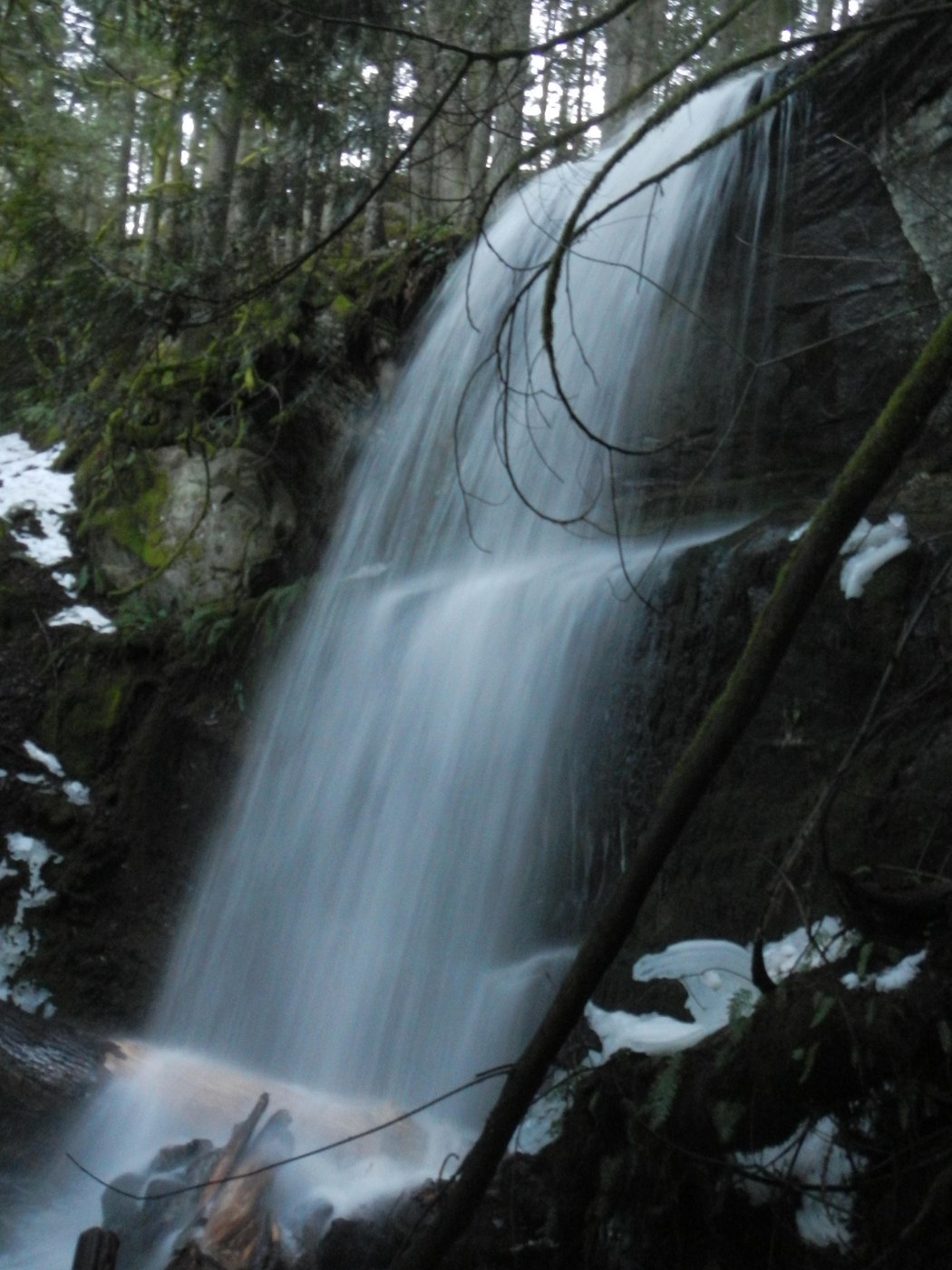 The side path to Lost Lake was less traveled. The lake was mostly ice covered yet. The waterfall was flowing strongly. There was not really any ice around it, just snow.
