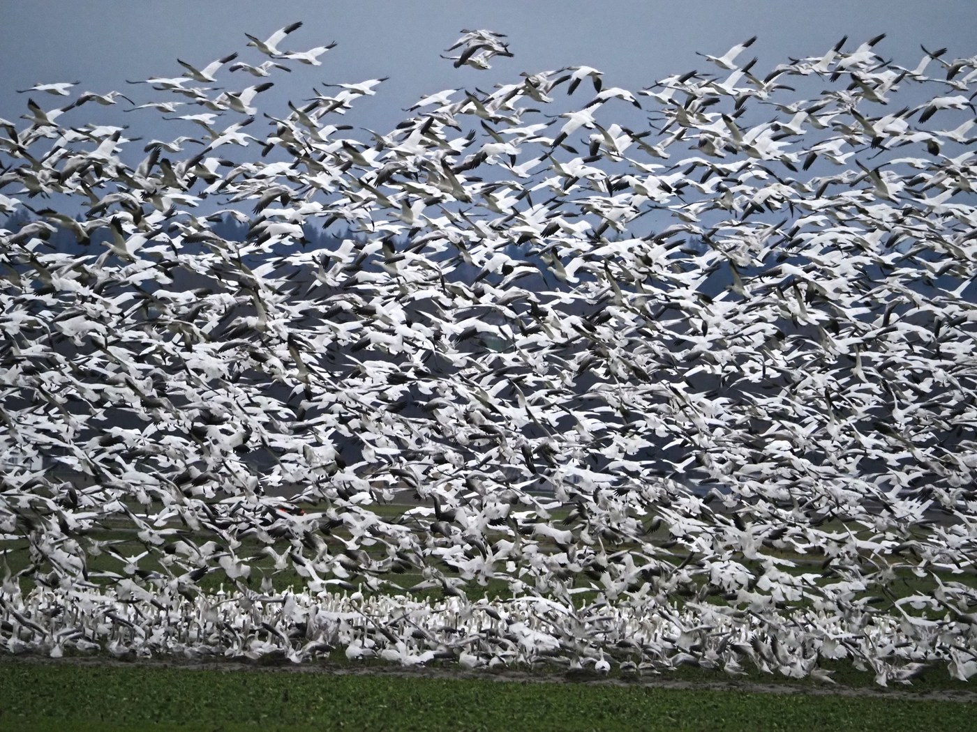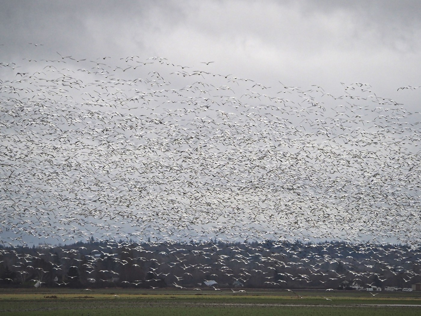 As we were driving from our campsite at Bayview SP to Camano Island, we saw thousands of snow geese flying above us coming from the waters of the bay at the end of the Rawlins Road. We watched and followed their path as they landed in a field along the Dry Slough Road. We were treated with many sights and sounds as an eagle flew toward them at 2 different times causing awesome flights and sound. At Camano Island SP, we hiked the Al Emerson Nature Trail which is a 1/2 mile loop through an old growth forest of grand fir, Doug fir, cedars and a few yew trees. There are 18 numbered interpretive signs along the way describing the various plants with words and pictures. Today there were no pamphlets available in the box at the TH. There was evidence of recent clearing of trees along the trail. Mr. Emerson was the first Ranger of Camano Island SP and from 1963 and 1973 when he retired he nearly single-handedly shaped his footprints in building this trail. Park workers were cutting up the trees which had fallen from the recent storm and high tides along the beach. There was evidence of heavy storm damage.