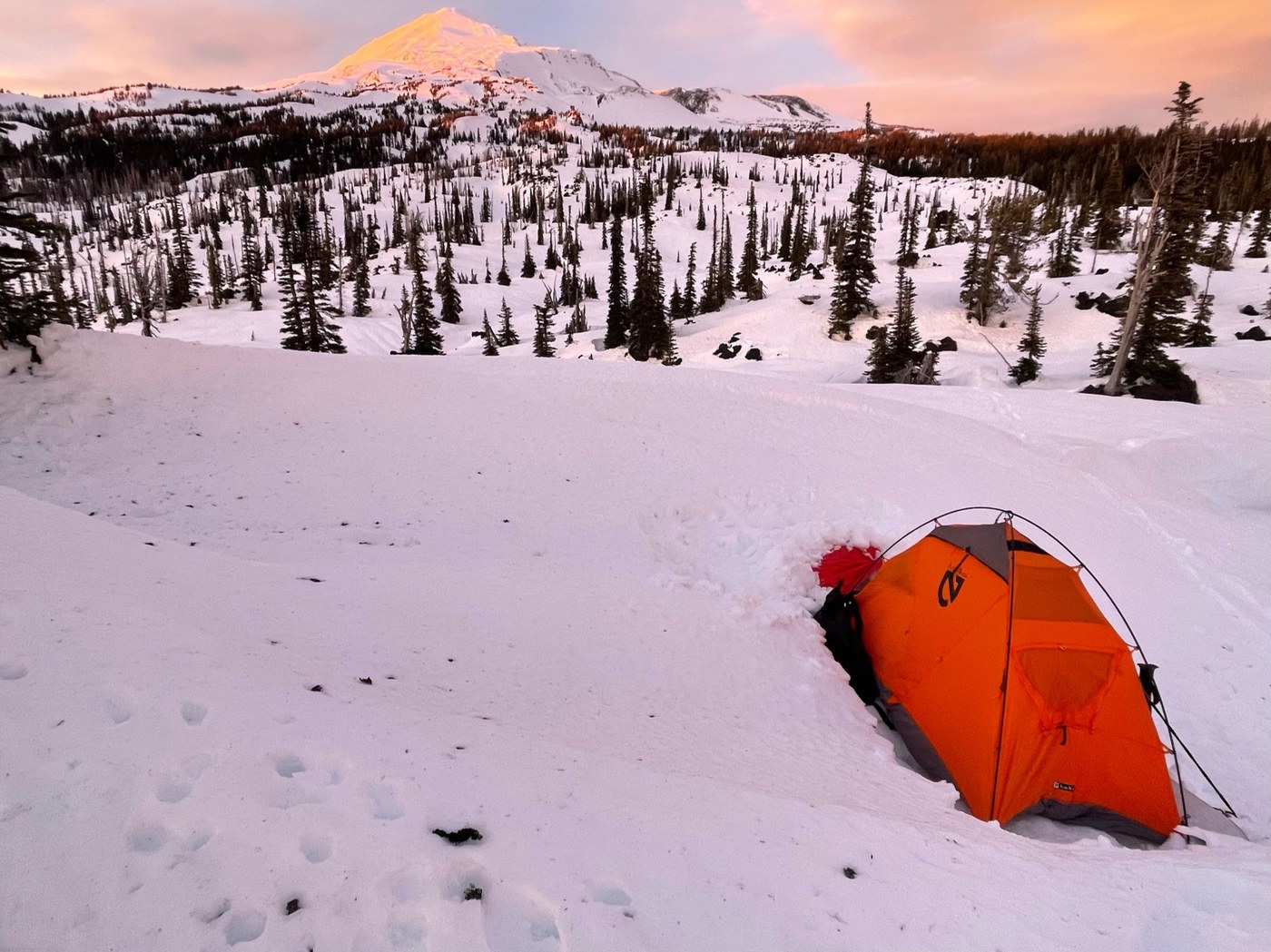My blue heeler Bella and I splitboarded from Pineside Sno-Park to the summit of Mount Adams this week (Jan 12-15, 2022), which was a little less than 10K vert and 30 miles. The road to Cold Springs was entirely covered in several feet of snow, and I don't have a snowmobile, so we parked at Pineside Sno-Park and went to and from there. Here's some quick "trip report" observations: the avy conditions were very good up there this week; there was a *lot* more snow at lower elevation than the same time last year (in particular is was easy to go straight through the AG Aiken Lava Bed) ; the snow was very good for snowboarding/skinning between 3K and 8K feet elevation, from 11K to 8K it was rideable coming down but a bit icy, and from the summit to 11K was horrible. In the wilderness (so above about 6K), I saw only one person the entire time off in the distance, a skier who also summited an hour before me.