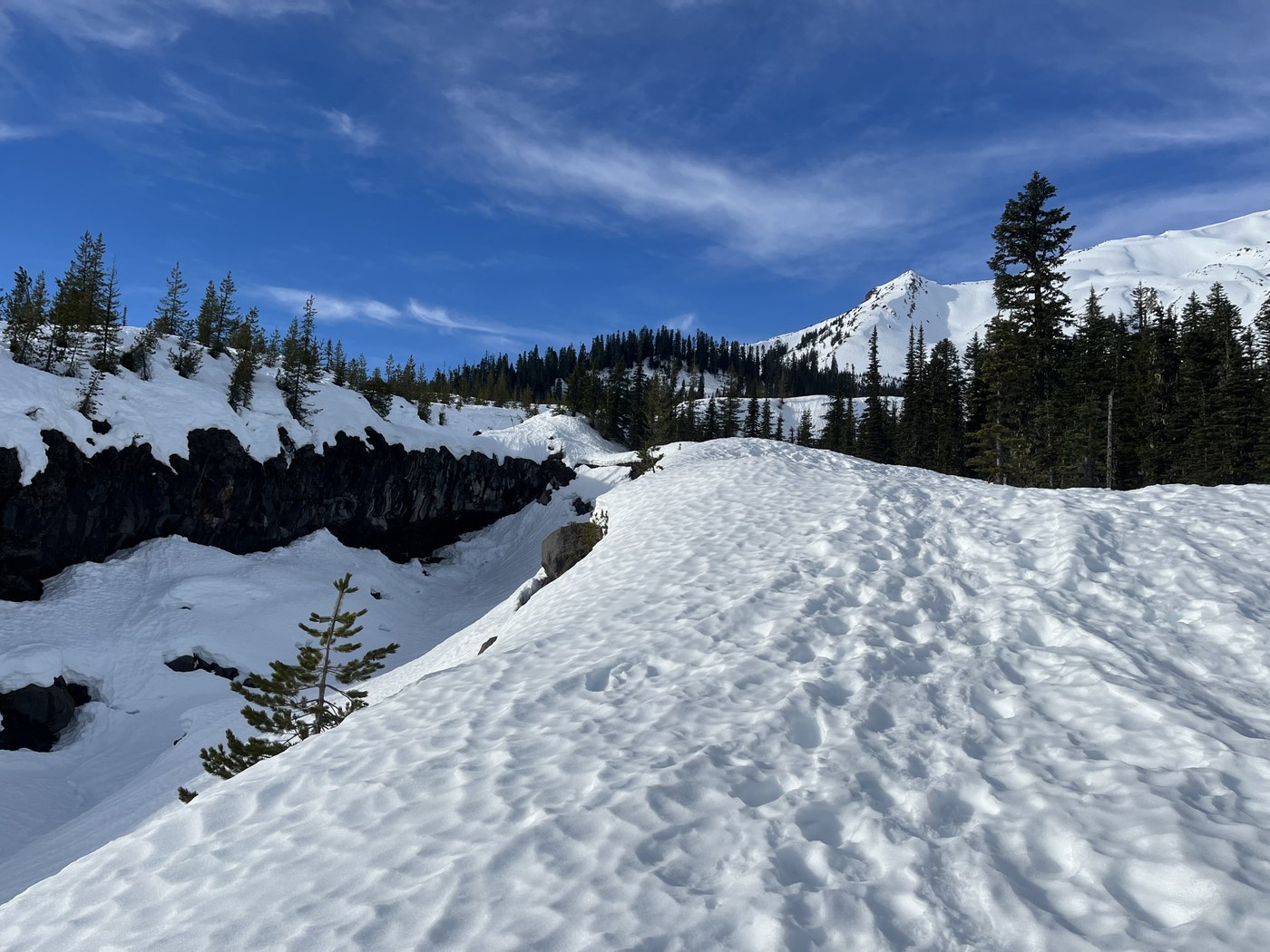 Ok, so no writes about good snowshoe routes with intermediate steepness, which is what we seek, and this is a great one. Easy up and down for the first 2 miles until you start up towards chocolate falls where it gets fun and you do a few thousand vertical - though need some skill -no longer beginner- Nd the view opens to the whole mountain. We didn’t go far past that because we like short and steep and then lunching with a view of mt hood in the distance. But others were headed to the crater which we’ll do in a day with more sunlight left. (You can turn right to June lake before the the fork to worm flows) to keep it easy and still beautiful.