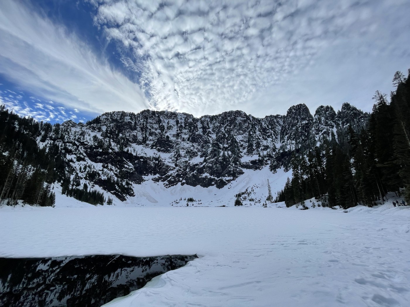 The second half of the hike is a different beast. You have to take your pack off and crawl under a downed tree, then you ascend switchbacks up a slope. This section I would definitely recommend microspikes or poles as some of the moves could get tricky. There are also a few sections that required some steep ascent or crossing a sketchy snow bridge. The snow was compact and icy which helped a lot but it might be difficult on a warm day. Make sure you stay on trail as some of the postholing can be several feet deep. Don’t even consider this trail on a day with high avalanche danger.